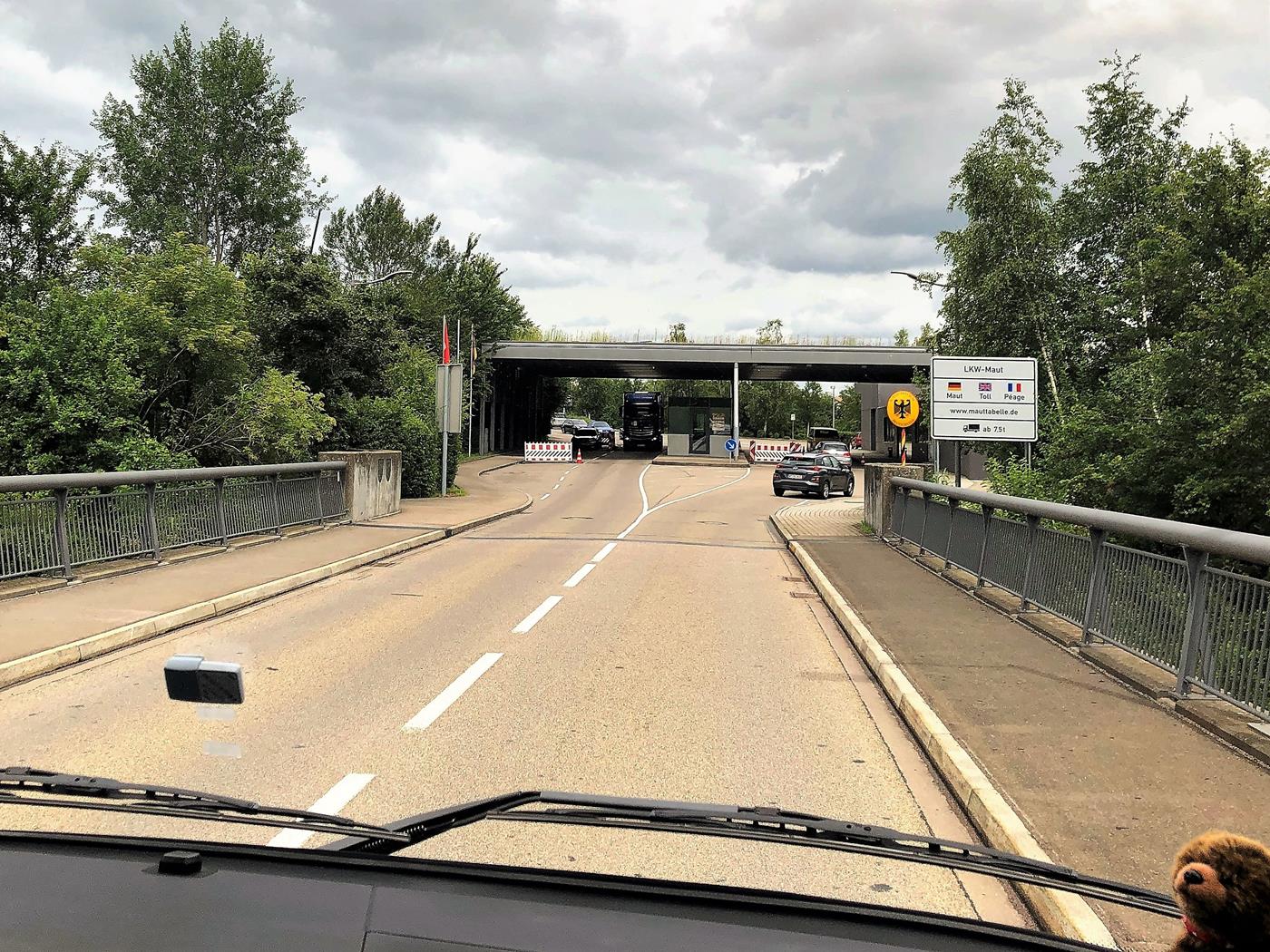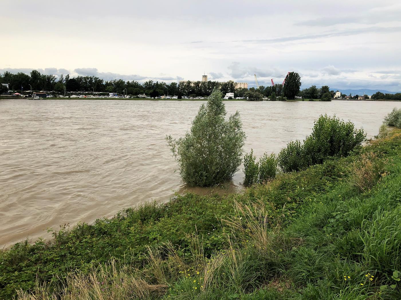 Unsere Mittagspause machen in Breisach am Rhein, da wir dort den Stellplatz für einen späteren Aufenthalt anschauen wollen. Der Rhein tritt hier schon leicht über die Ufer und auch beim Grenzübergang in Rheinfelden ist der Pegel sehr hoch.