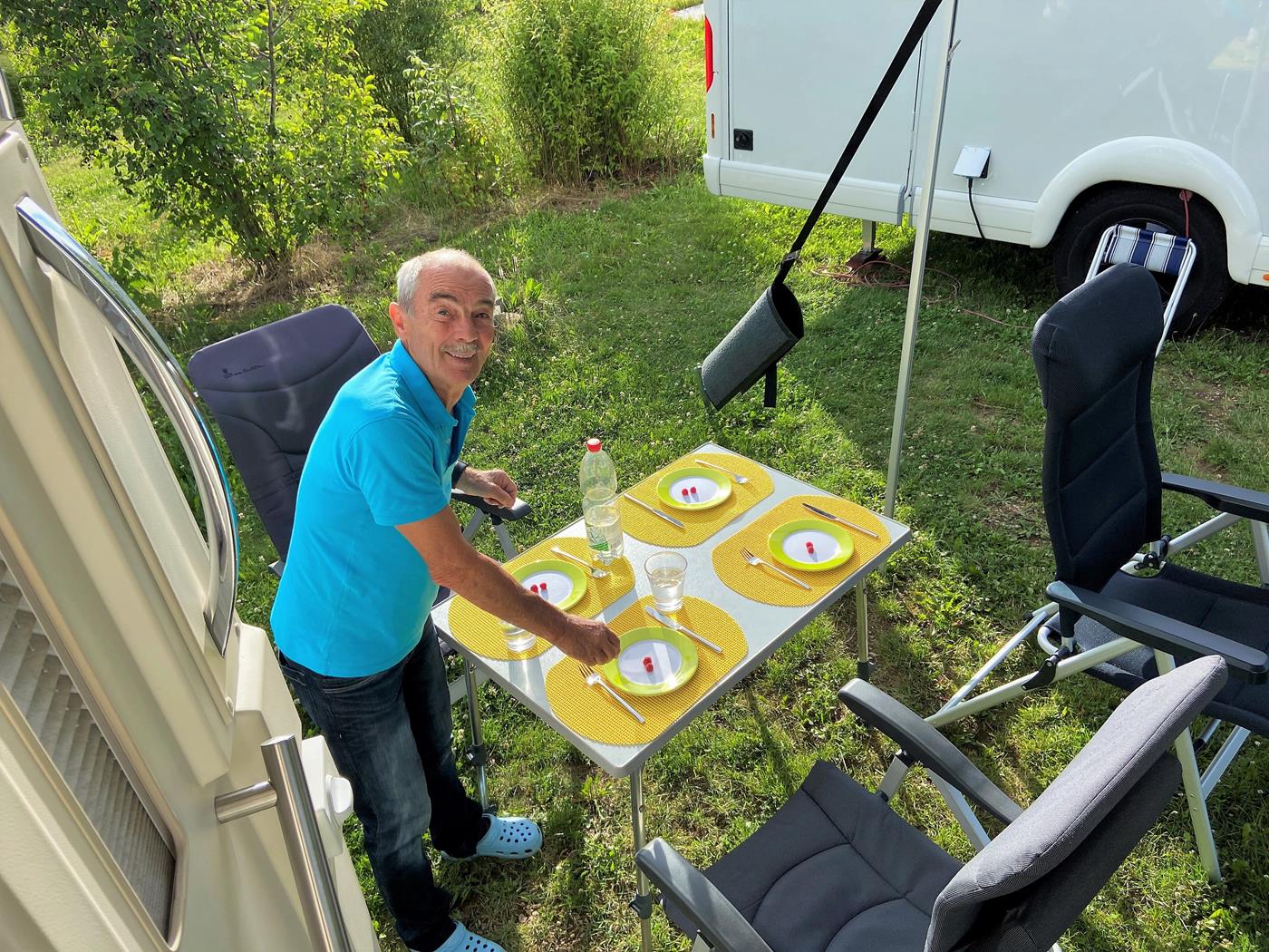 Bei wolkigem und kühlem Wetter fahren wir um 12:30Uhr los und erreichen um 14:30Uhr bereits die Grenze bei Laufenburg. Um 16:00Uhr treffen wir uns mit Brunhild und Dieter auf dem Reisemobilhafen Bad Dürrheim . Es ist auch hier kühl und nass, somit die beste Gelegenheit es uns im neuen Wohnmobil von Brunhild und Dieter gemütlich zu machen.