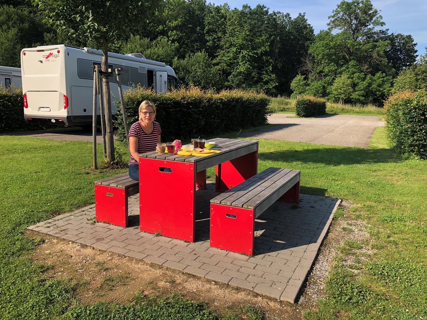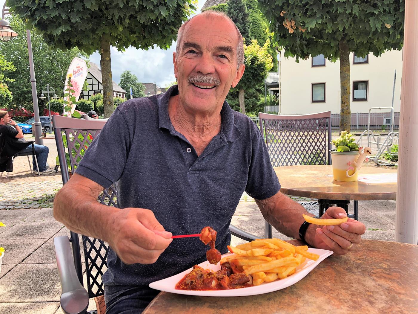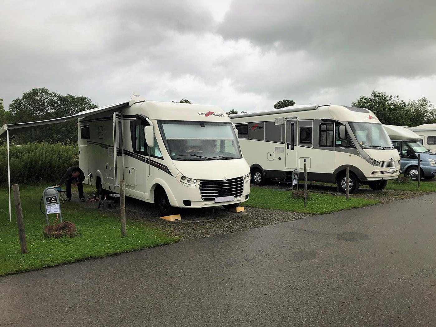 Unterwegs kommen wir auch ab und zu in heftige Regenschauer aber in Bodenwerder scheint schon beinahe die Sonne und wir freuen uns auf die feine Currywurst, die es auf dem Stellplatz gibt.