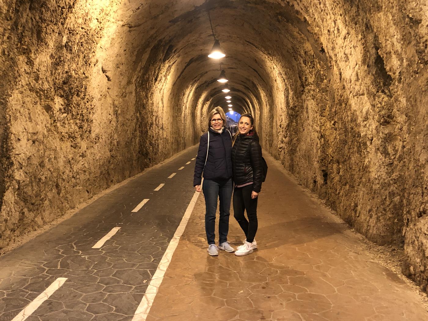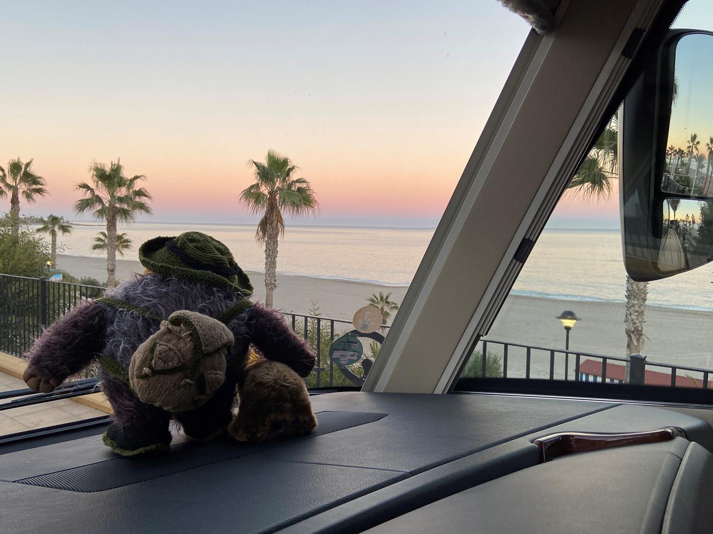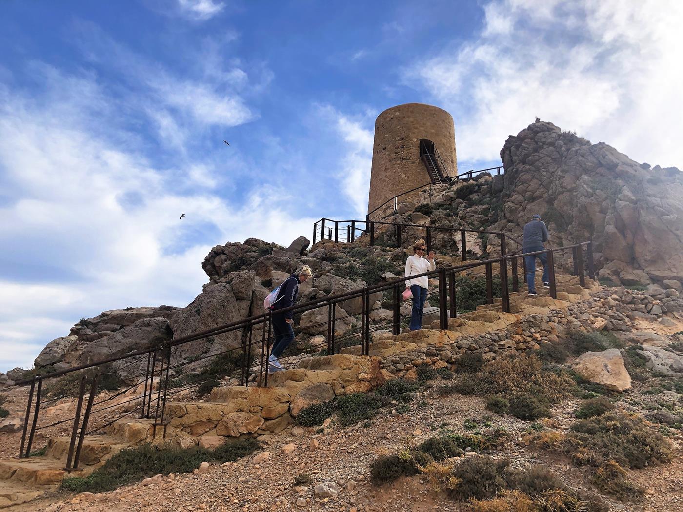 Da wir nicht heiraten wollen, haben wir heute den perfekten Sonnenaufgang aus unserem Wohnmobil bestaunt und daneben noch unser neues Auto eingelöst. Jetzt ist dieses Datum in unserem Fahrzeugausweis verewigt (und unser Autoverkäufer hat heute geheiratet…)Zur Feier des Tages machen wir einen langen Strandspaziergang mit Carol und Bob und gehen gemeinsam fein essen.Auch heute Mittwoch, gibt es wieder einen wunderbaren Sonnenaufgang. Nach dem Frühstück nehmen uns Carol und Bob mit ihrem Auto mit auf eine Fahrt durch die nahen Berge. Den ersten Halt machen wir beim Torre del Pirulico. Die Treppe im Inneren des Turmes ist schmal und steil, aber sobald wir es bis oben geschafft haben, ist die Aussicht (und der Wind) atemberaubend.