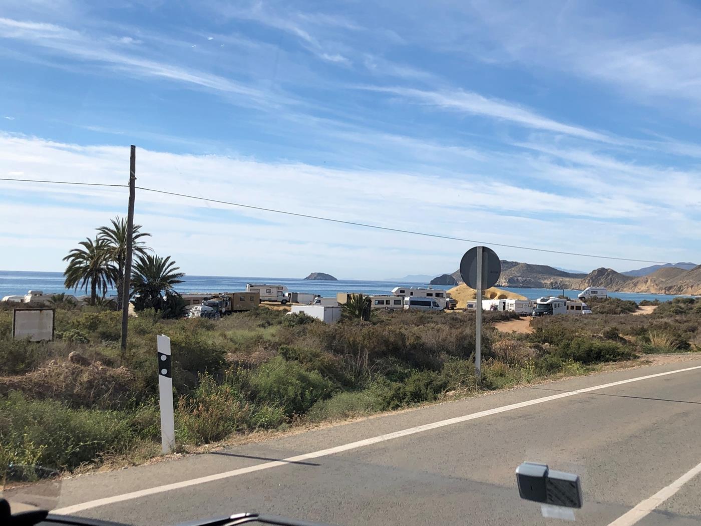 Wie von Bob empfohlen, fahren wir nach Aguilas auf der AL 7107 via San Juan nach Mojácar.Auf dem Weg sehen wir auf jeder freien Fläche beim Strand Wohnmobile stehen und es ist schon etwas beängstigend, wenn man diese Menge sieht.Meine Sorgen sind unbegründet, wir haben einmal mehr Glück und können uns auf den letzten Platz an der Promenade stellen.