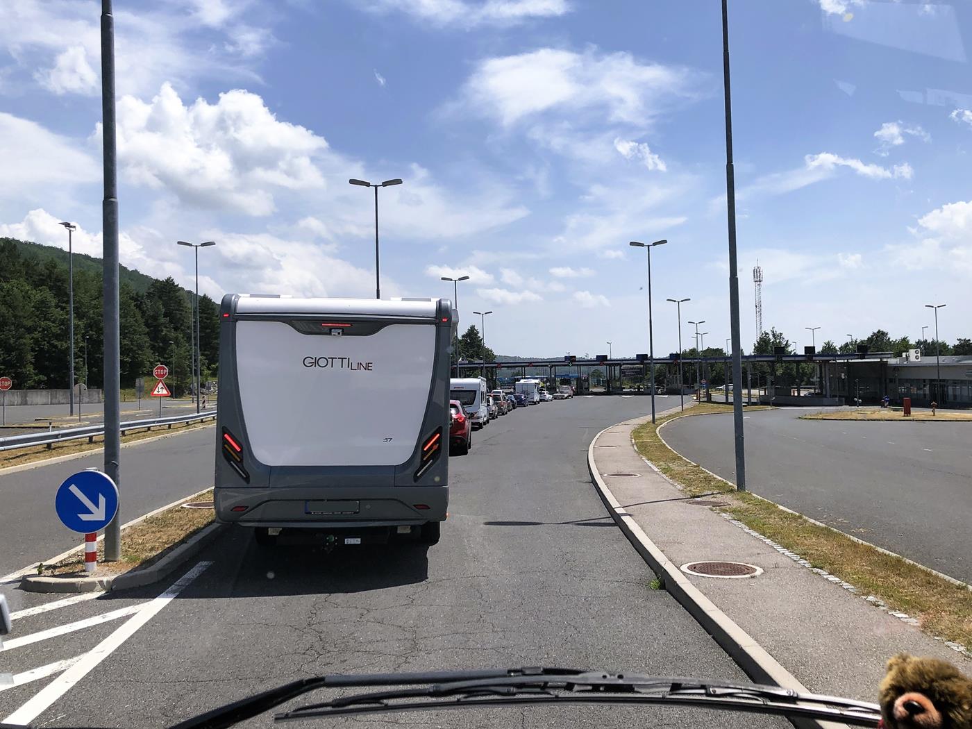 Beim Grenzübergang bei Rupa gibt es einen kleinen Stau. Dieser hält sich heute zum Glück in Grenzen, aber an den Wochenenden wird es einiges länger dauern. Grund für den Stau ist, dass die slowenisch-kroatische Grenze auch die Schengen-Aussengrenze ist. Wer diese Grenze überschreitet, verlässt entweder den Schengen-Raum oder reist in den Schengen-Raum ein – mit der Konsequenz, dass man in der Regel eine Personenkontrolle über sich ergehen lassen muss.
