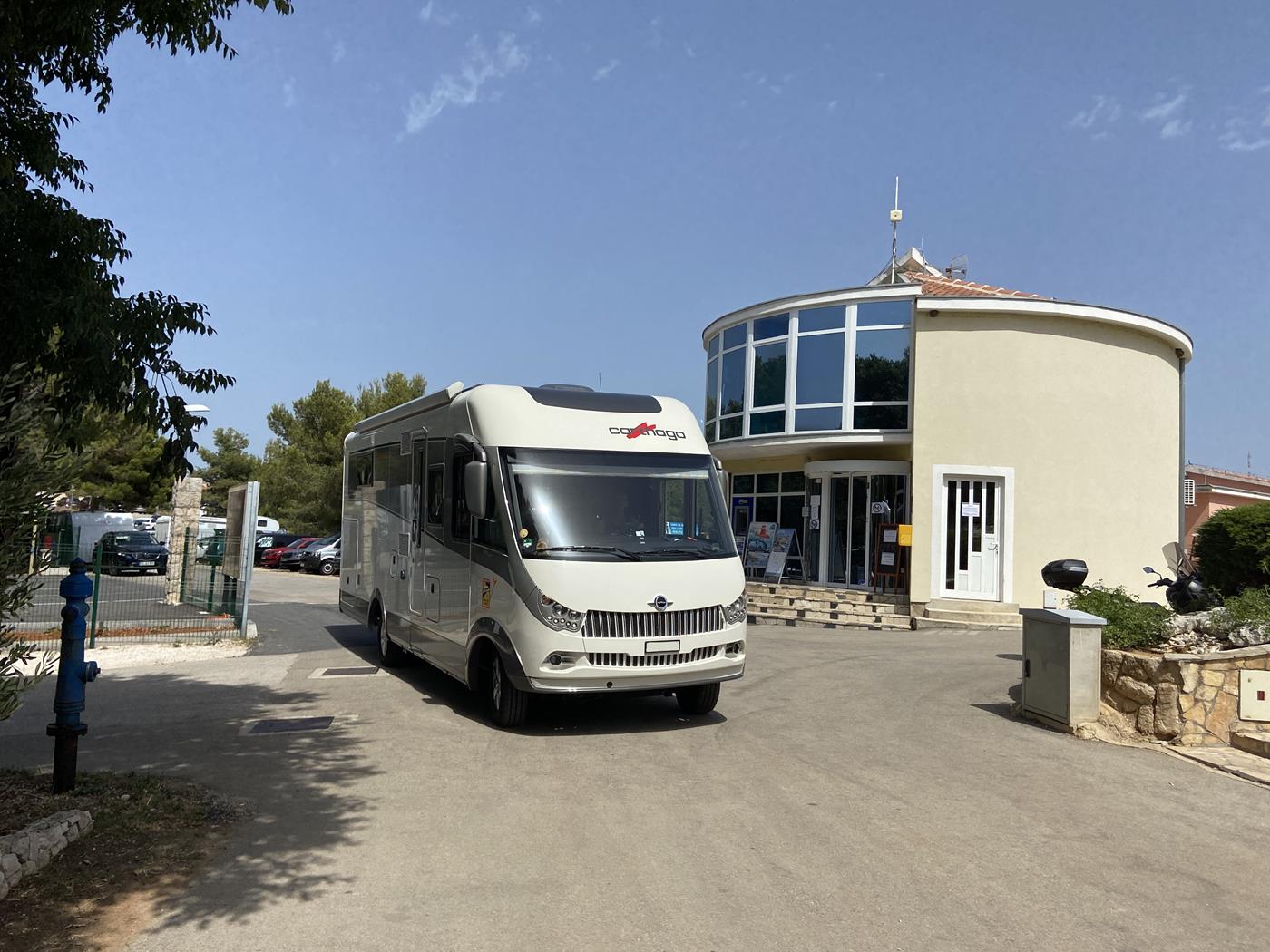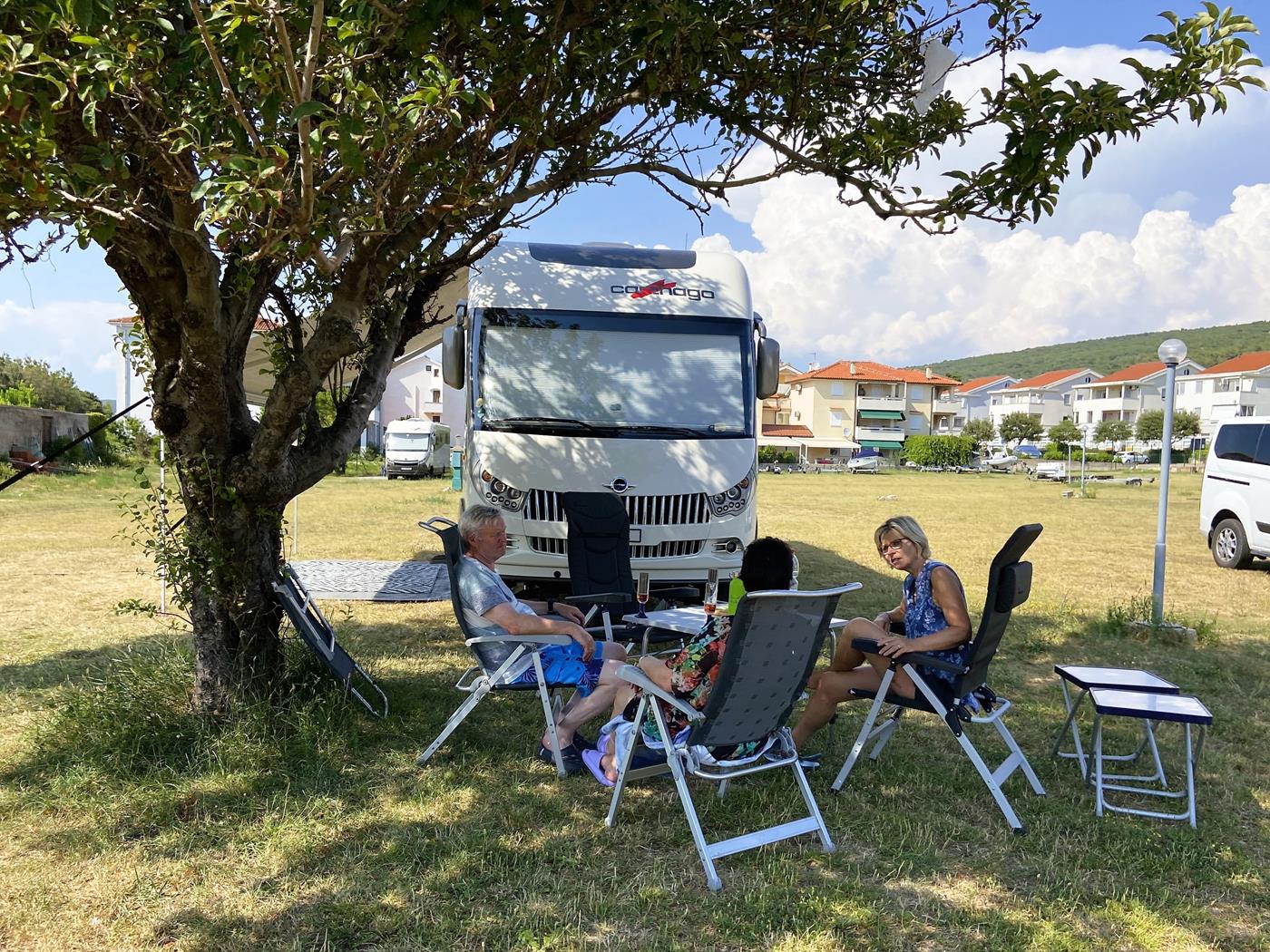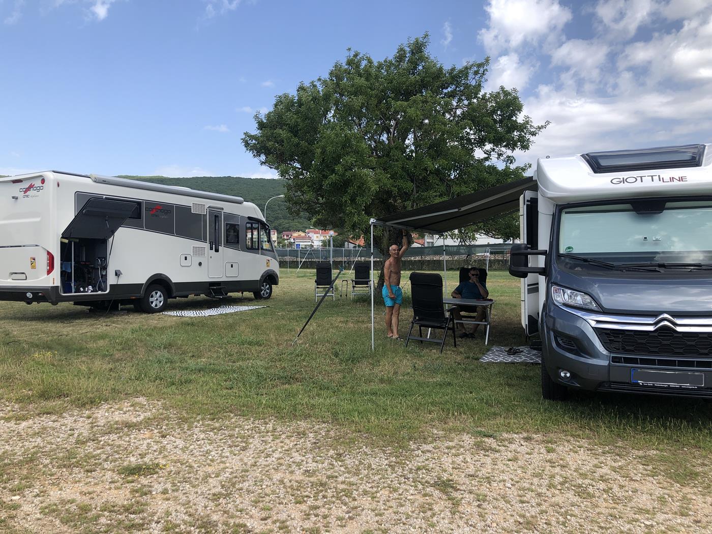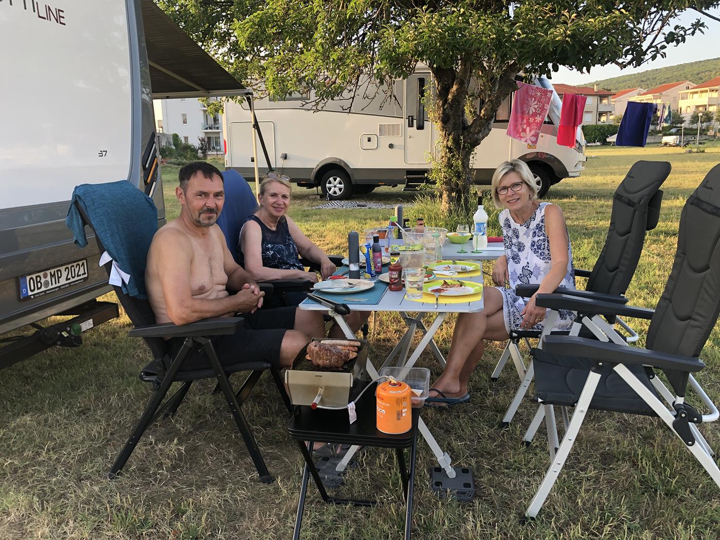 In Punat angekommen, fahren wir zum Campingplatz Kamp Pila und sehen schon von weitem, dass der Platz beim Baum noch frei ist. Dort richten wir uns ein und geniessen nach der langen Fahrt einen gemütlichen Grillabend.