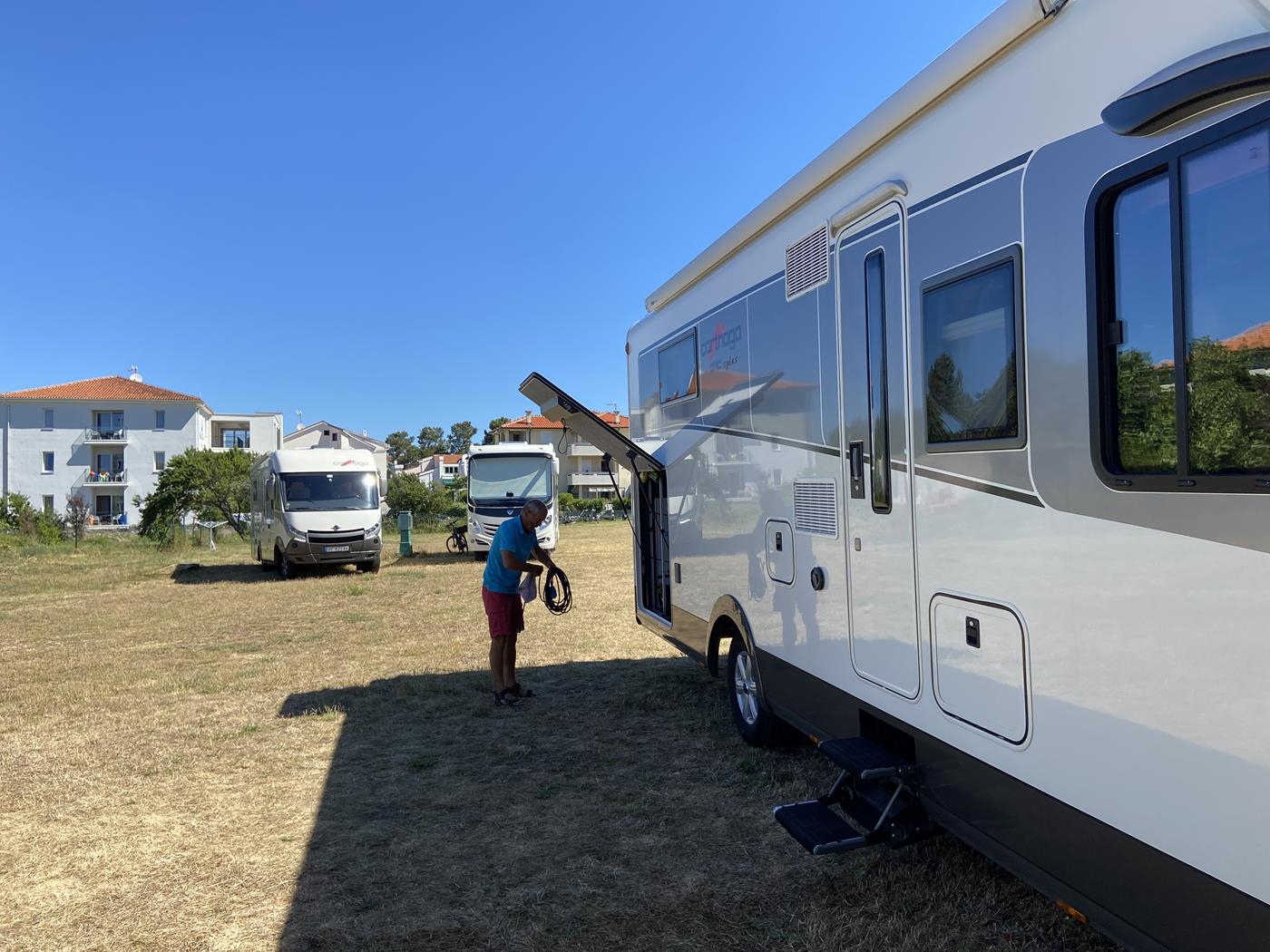 Auf den Campingplatz Kamp Pila ist der Platz unter dem Baum auch diesmal noch frei. Wir nehmen das gerne an und stellen uns wieder auf unseren Lieblingsplatz. Tove und Geir sind auch schon da und wir freuen uns, dass wir uns nach der langen Zeit wieder sehen können.