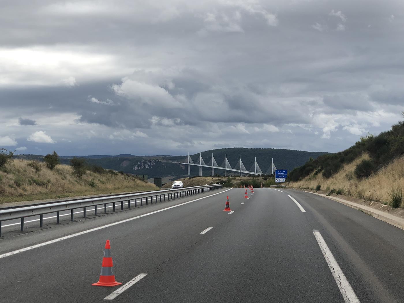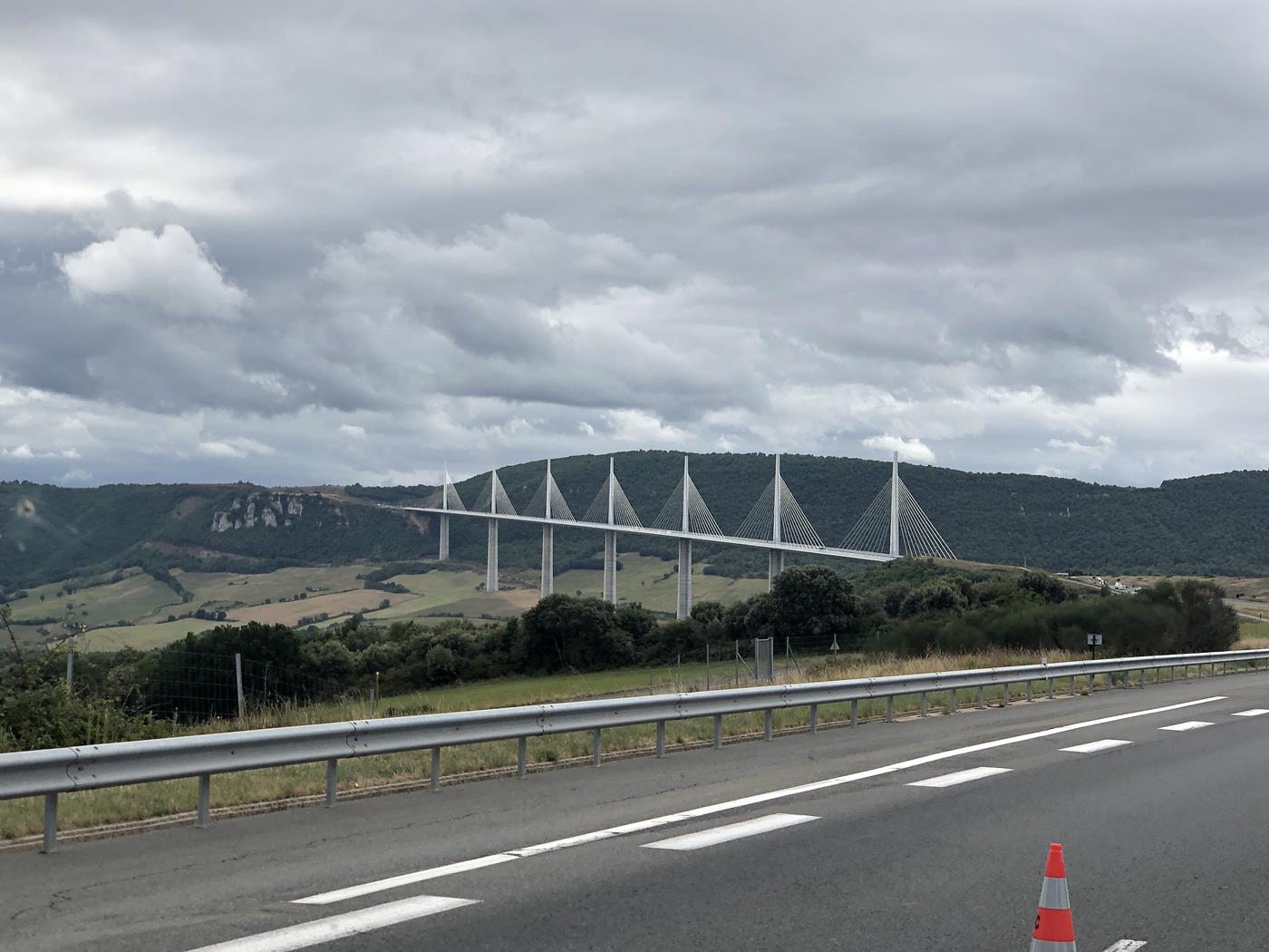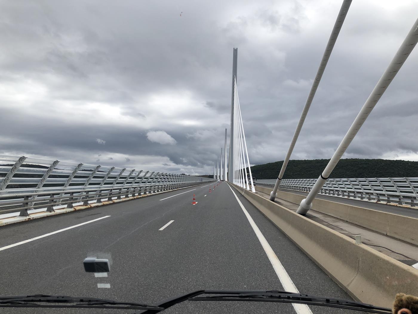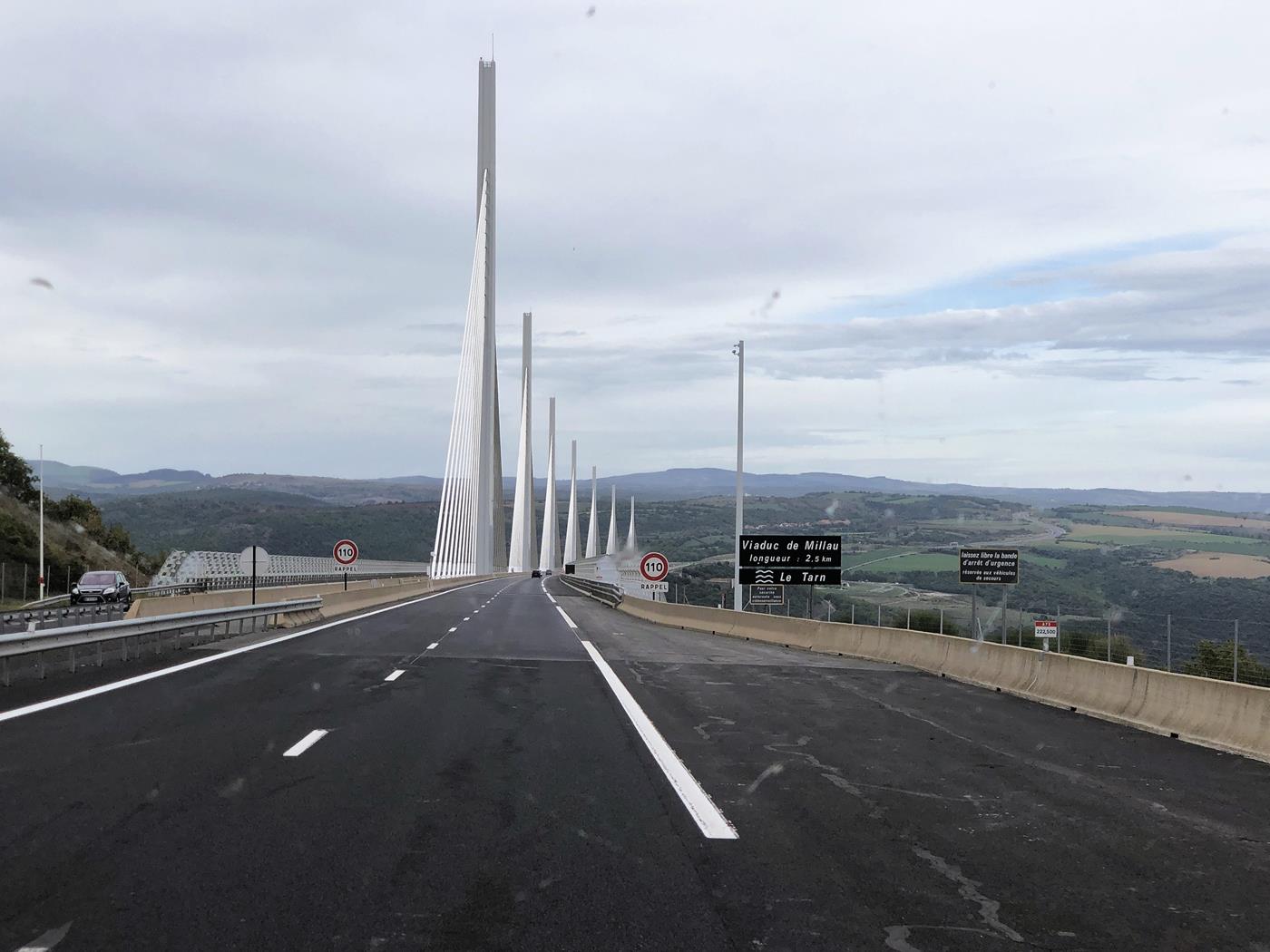 Etwa zwei Stunden später fahren wir über den Viaduc de Millau. Er ist mit 2460m die längste Schrägseilbrücke der Welt.