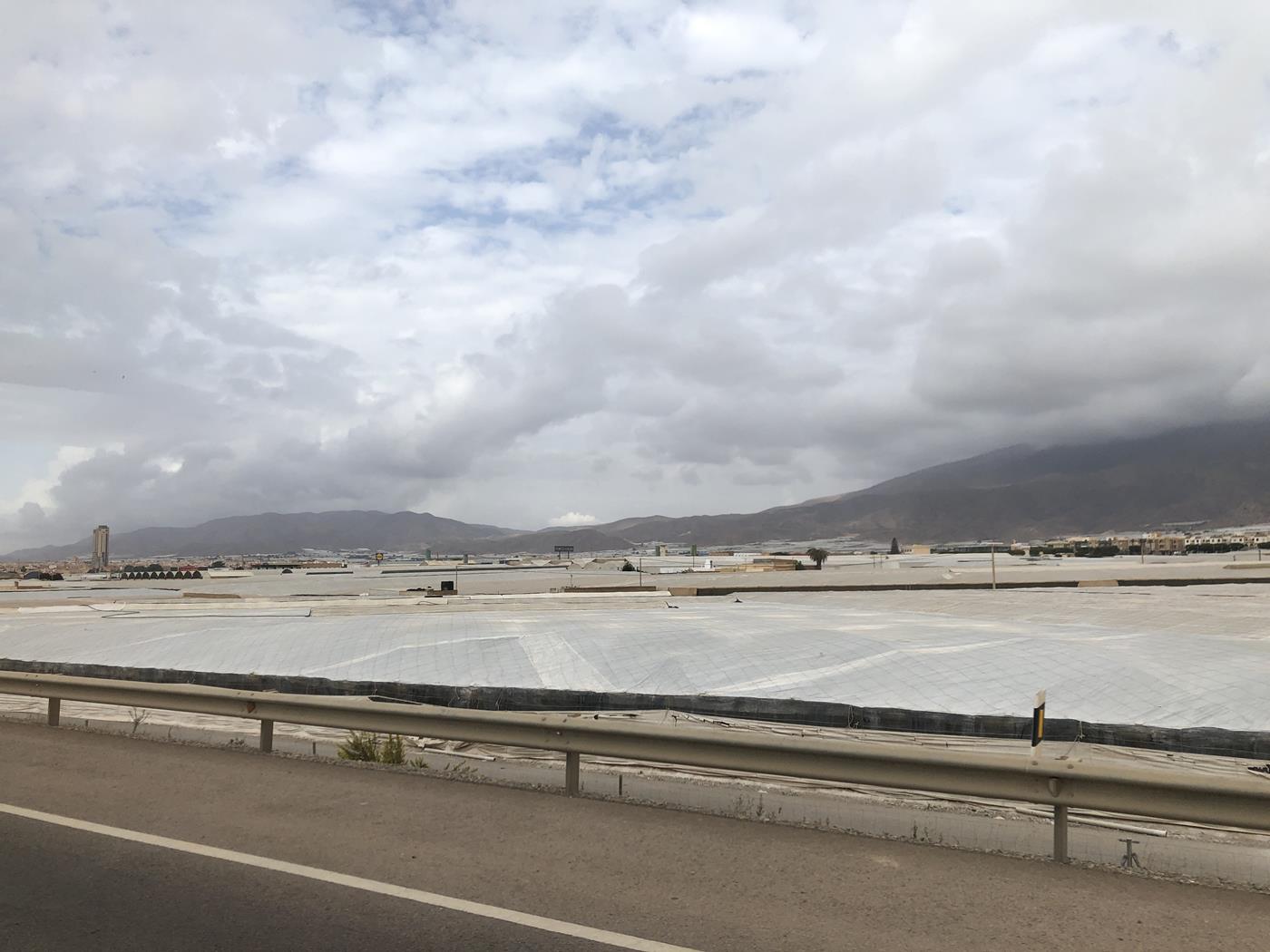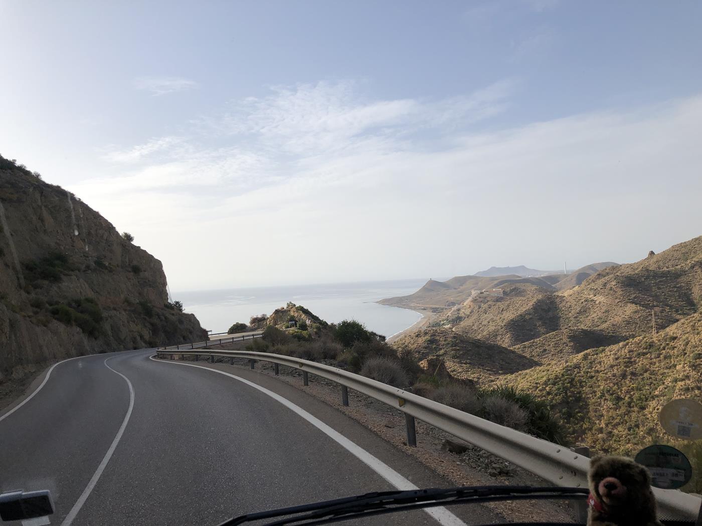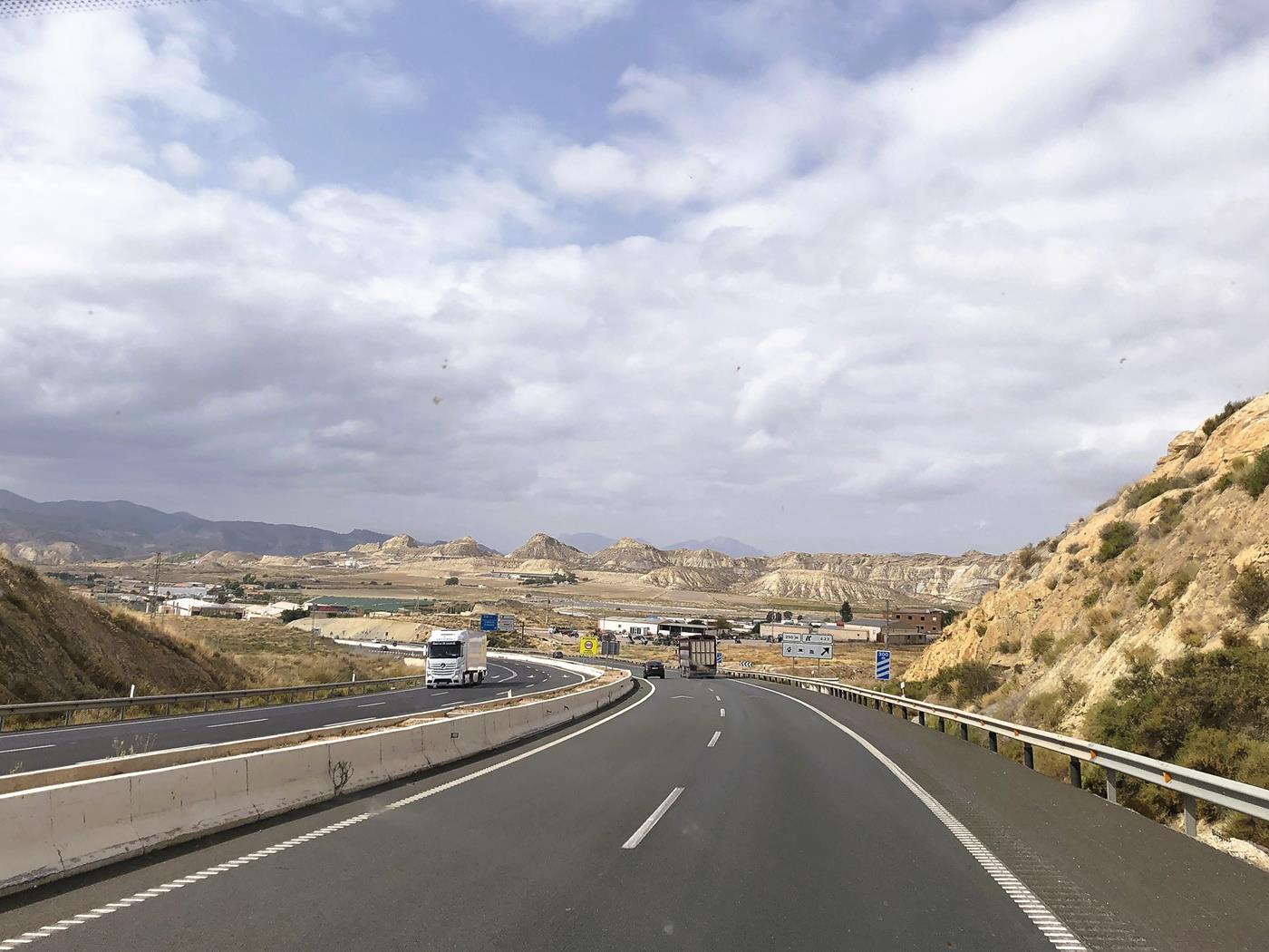Noch einmal den Sonnenaufgang bewundern und dann fahren wir nach dem Frühstück zuerst auf der AL5107 bis Carboneras, dann auf der N341 bis Venta del Pobre, wo wir die A7 nehmen. Die Halbwüsten der Provinz Almería dienten schon oft als Kulisse für spektakuläre Filme und sind immer wieder ein Erlebnis. Später auf unserem Weg liegen weite Flächen unter den Plastikplanen der Gewächshäuser. Hier wächst ein grosser Teil des Gemüses, das wir bei uns kaufen können.