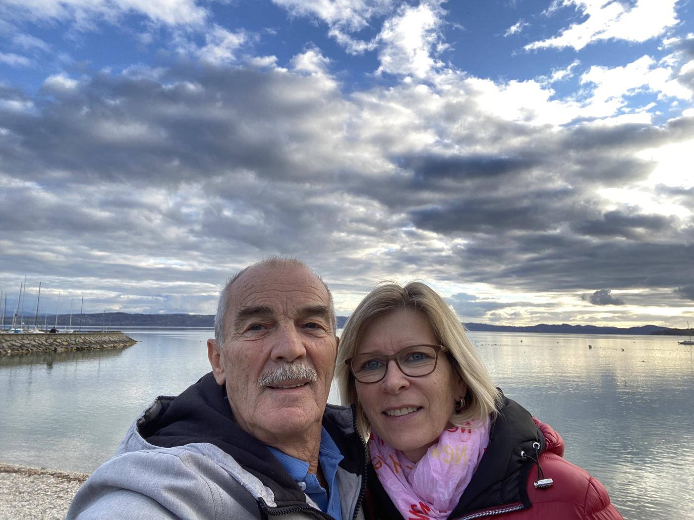 Obwohl im Veranstaltungssaal hinter dem Parkplatz ein Theater aufgeführt wurde, haben wir gut geschlafen und geniessen das Frühstück mit Blick auf den See.
