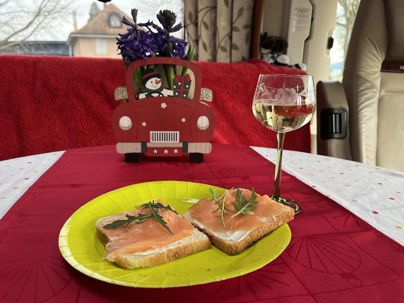 Auch heute finden wir auf Anhieb einen passenden Parkplatz. Vor unserem ausgedehnten Spaziergang durch Saint-Aubin geniessen wir noch unser Silvestermittagessen. Es gibt Lachsbrötchen und Sekt.Der Abend verläuft sehr ruhig und ohne Knallerei. Wir geniessen ein feines Abendessen und stossen um Mitternacht draussen an. Prosit Neujahr! Es ist recht kühl und die Bise bläst uns unangenehm um die Ohren.