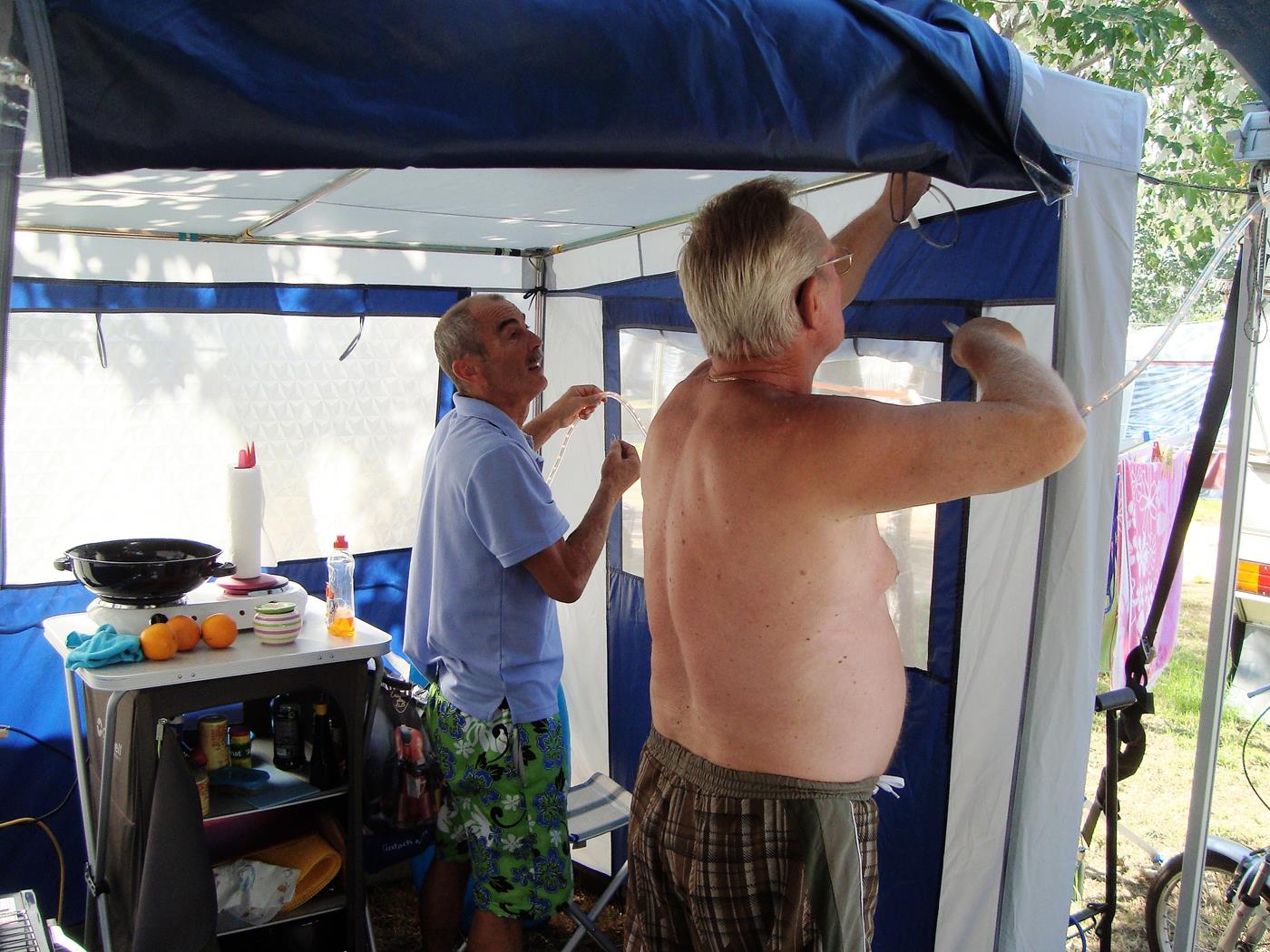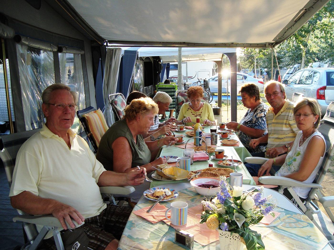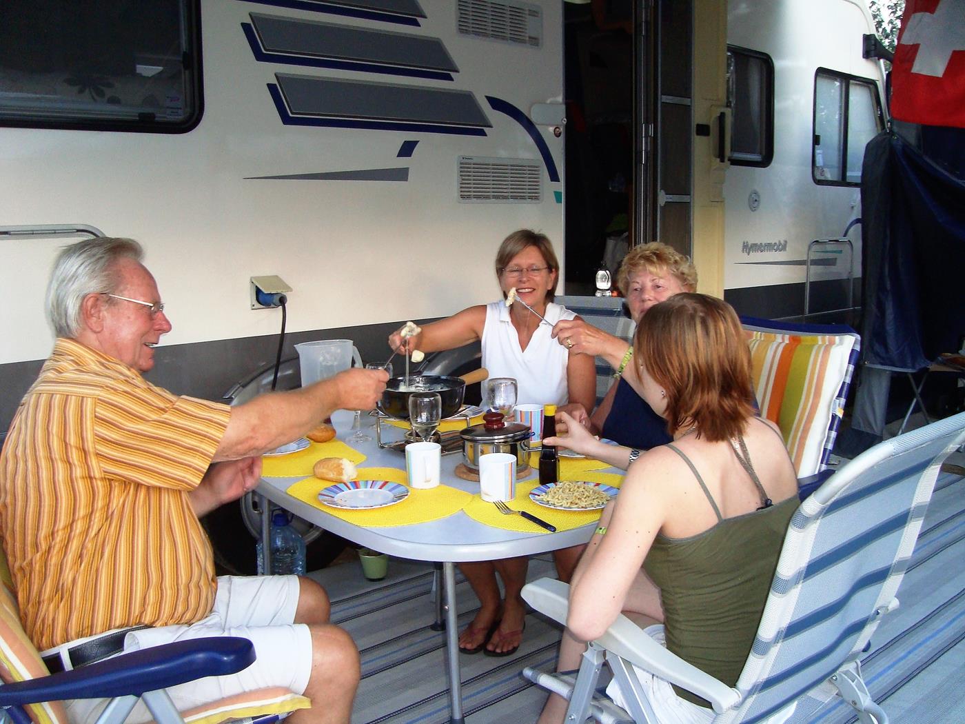 Es regnet nicht mehr, die Sonne scheint, aber es ist noch kühl - wir frühstücken im Wohnmobil. Anschliessend begrüssen wir unsere Freunde Wilma und Wolfgang und beziehen unseren reservierten Platz neben ihnen. Zu meinem Geburtstag, erhielt ich von unseren Kindern ein Küchenzelt, welches nun ebenfalls aufgebaut wird. Montag, 01.10.2012 Begrüssung rundherum