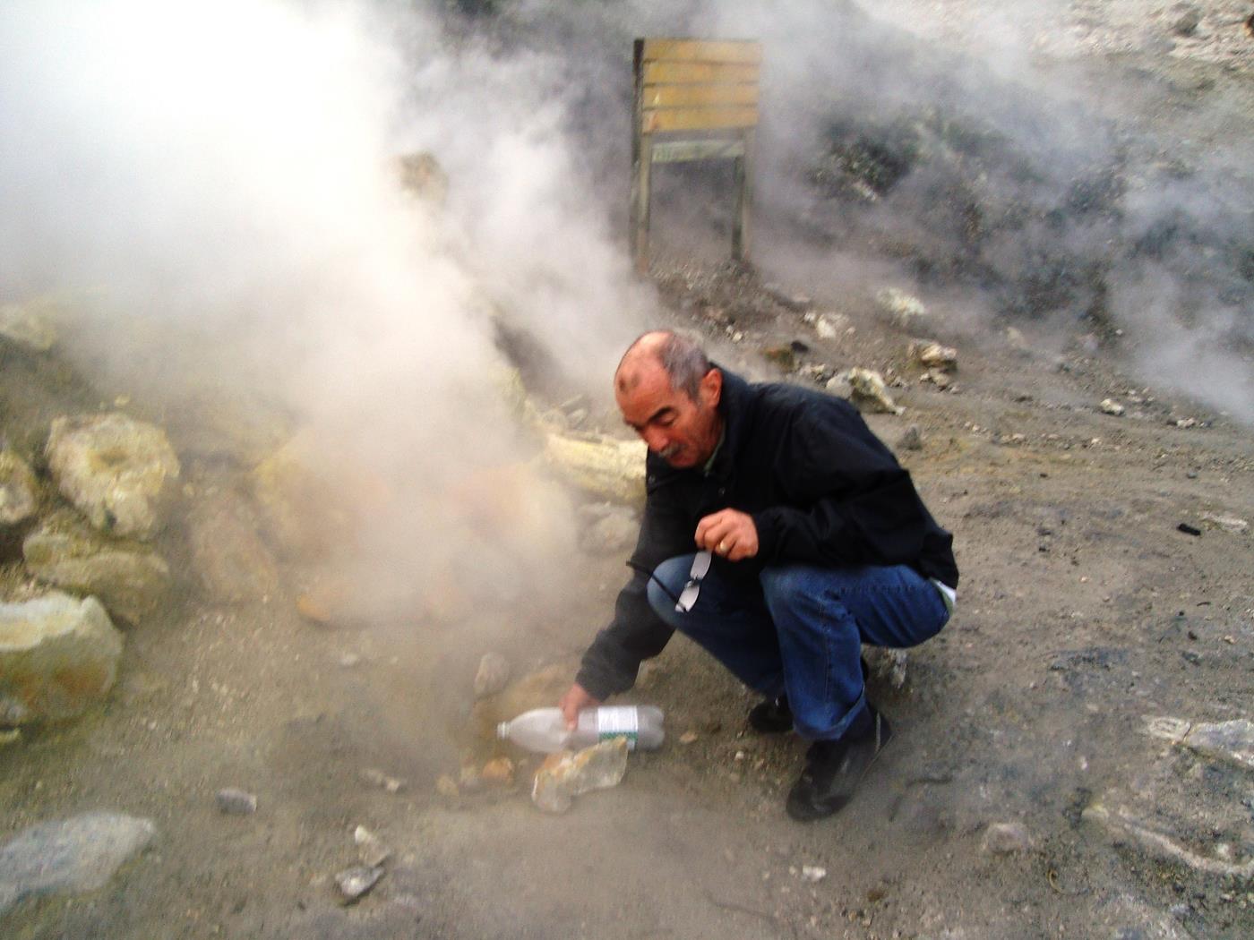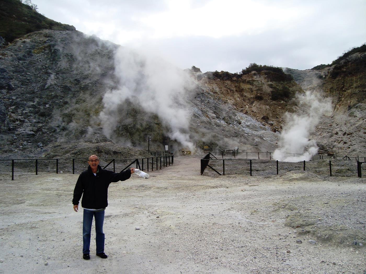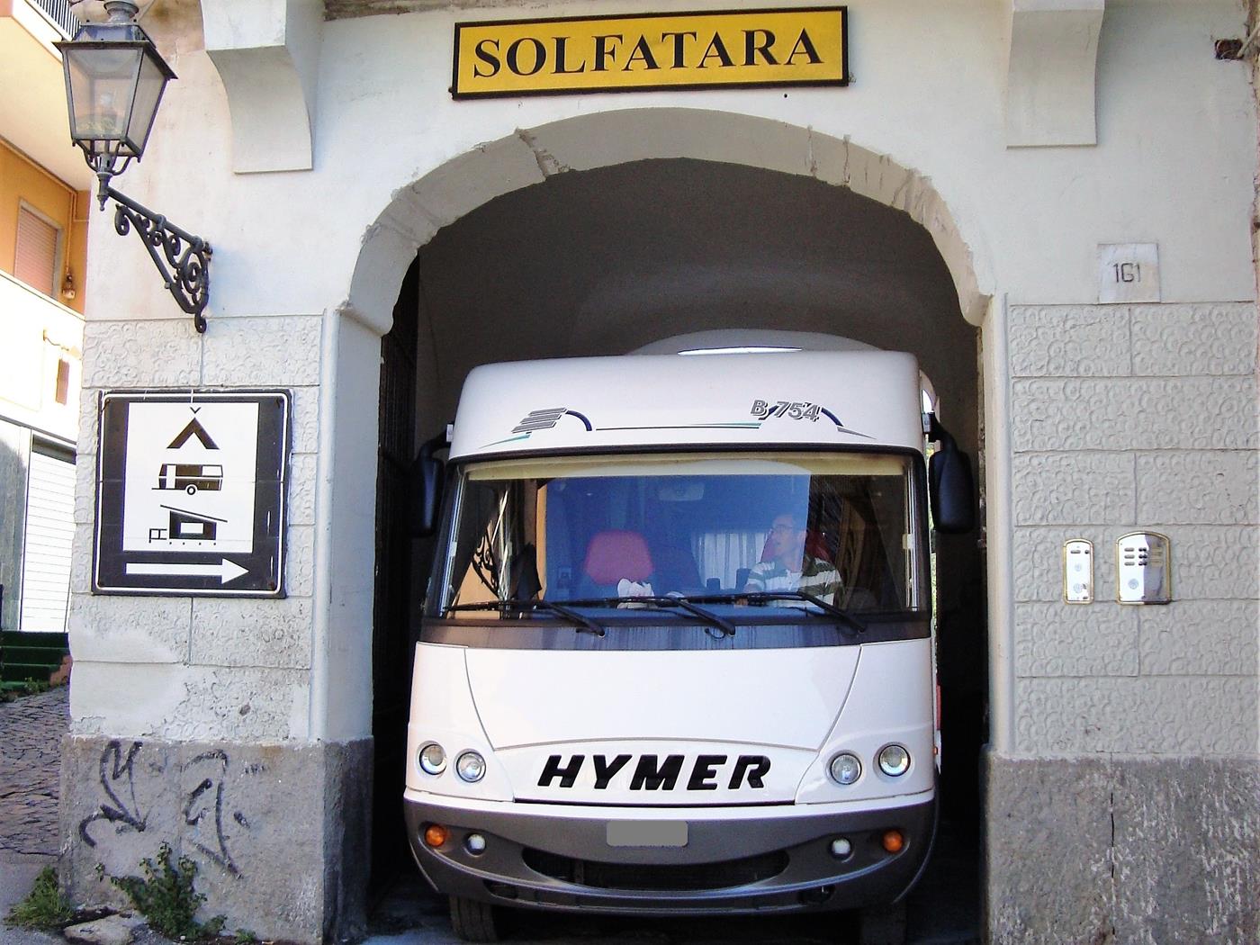 Heute scheint unser Glückstag zu sein. Wir kriegen einen Platz auf dem Campingplatz Int. Vulcano Solfatara, Via Solfatara 161, 80078 Pozzuoli und Glück haben wir, dass wir durch das schmale und niedrige Eingangstor passen – und es regnet heute nicht, manchmal sieht man sogar die Sonne! Der Campingplatz liegt mitten im Krater und das riecht man deutlich. Wir erkunden den Krater und der Geruch der Schwefeldämpfe macht das Atmen schwer –es stinkt zum Teil fürchterlich nach faulen Eiern. Der Boden ist warm und es entweichen heisse Dampfströme. Um ein eindrückliches Souvenir zu haben, fange ich diese Dämpfe in eine PET-Flasche. Es hat funktioniert, zu Hause konnten unsere Kinder und unsere Freunde diesen Geruch noch deutlich feststellen und einatmen.Heute Abend wollen wir wieder einmal die italienische Küche geniessen und so machen wir uns auf den Weg ins Städtchen (ohne Regenschirm). Sicherheitshalber kaufe ich mir unterwegs dann doch noch einen, denn der Himmel bedeckt sich und ich bin überzeugt davon, dass wenn ich einen Schirm kaufe, es nicht regnen wird.Im Ristorante Pizzeria La Frasca geniessen wir ein wunderbares, typisches Abendessen. Es war super, wir erhalten verschiedene Vorspeisen, eine Fleischspeise, Dessert, Espresso und dann noch einen ordentlichen Limoncello. Das ganze kostet € 27.00.Als wir bezahlt haben und gehen wollen, schüttet es wie aus Kübeln, da hilft nicht mal mein kleiner Schirm - wir warten bis sich das Gewitter etwas verzogen hat.