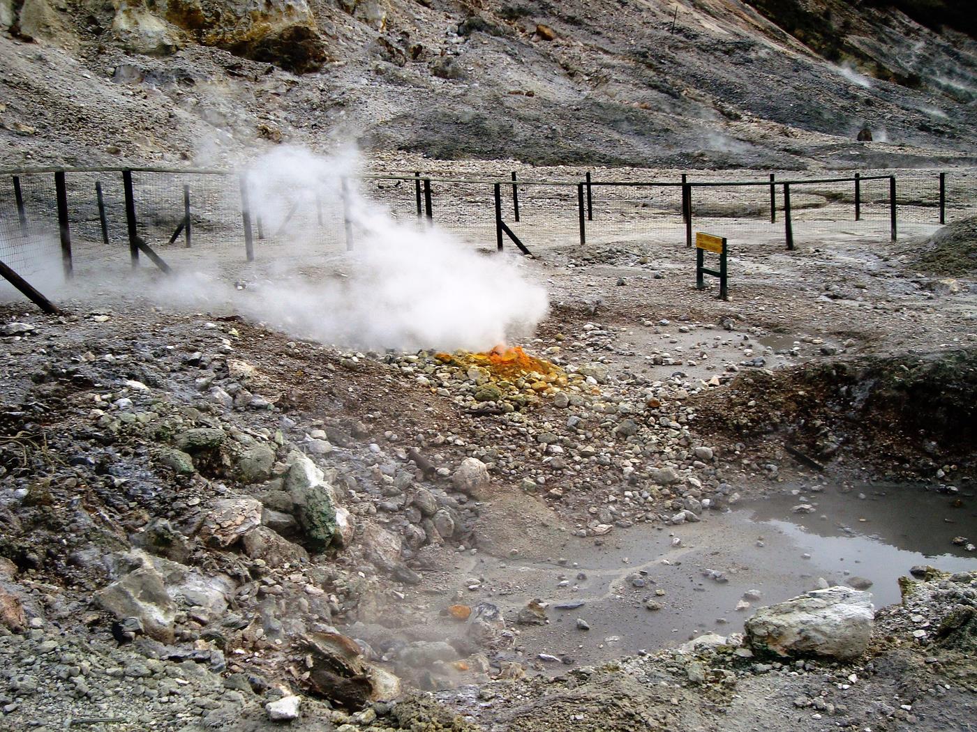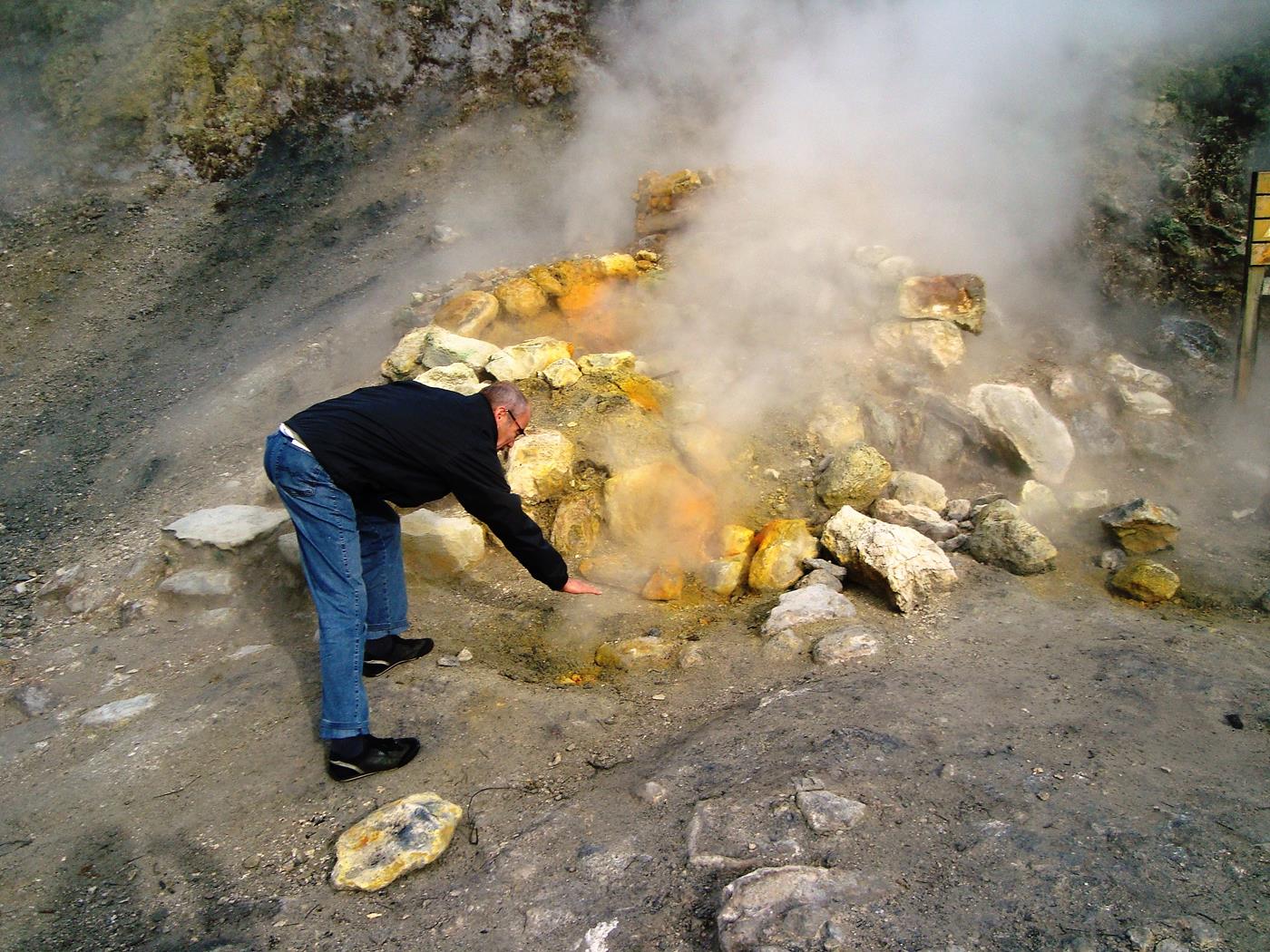 Der Palast von Caserta ist eines der grössten Schlösser Europas und wurde als Residenz der Bourbonen für deren Herrschaft über die Königreiche Neapel und Sizilien errichtet. Im Inneren des Schlosses gibt es mehr als 1200 Räume. Die Fassaden sind von 1970 Fenstern durchbrochen. Das Wetter ist wie bisher: kalt, Regen und starker Wind. In der Nähe des Schlosses gibt es eine Einstellhalle welche auch für Camper Platz bietet, das Parkieren kostet aber beinahe gleich viel wie eine Übernachtung auf einem Campingplatz.Die Besichtigung des Parks ersparen wir uns, dass Wetter ist einfach zu schlecht.Die Reise geht weiter nach Pozzuoli um den Vulkankrater Cratere Solfatara zu besichtigen. Der Krater wird touristisch genutzt, u.a. befindet sich ein Campingplatz im Westteil der Solfatara. Auf Erläuterungstafeln werden vulkanologische und botanische Themen behandelt. Im Krater selbst befindet sich noch eine altertümliche 'Sauna' aus der Römerzeit, die damals wie heute die natürliche Erdwärme und die Dampferzeugung nutzt. Kraterbesuche für Tagestouristen sind entgeltpflichtig, Campingplatztouristen haben freien Zutritt.