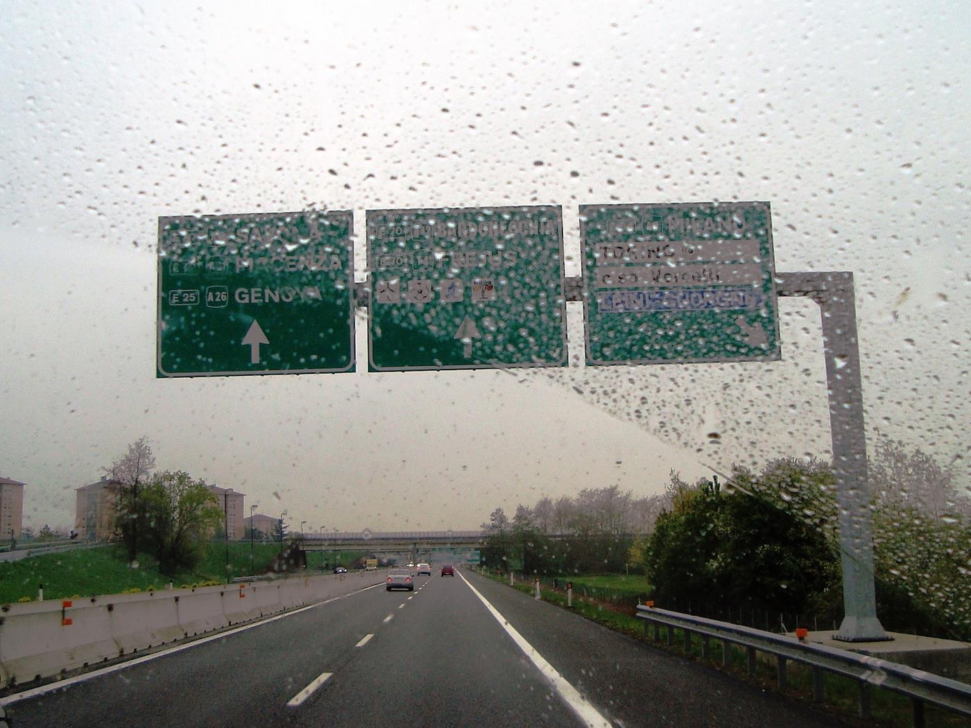 Unsere Route führt uns durch den Tunnel des Grossen Sankt Bernhard. Dieser hat eine Länge von 5798m und eine einmalige Durchfahrt kostet € 37.90, bzw. Fr. 45.40. Das ist ein stolzer Preis, um einmal durch diesen Tunnel zu fahren! Der Gotthardtunnel ist beinahe dreimal länger, nämlich 16900m und ist gebührenfrei. Da verstehe ich meine Deutschen Freunde nicht die sich über unsere Autobahn-Vignette für Fr. 40.00 beklagen. Diese ist 14 Monate gültig und man kann damit auch durch sämtliche Schweizer Tunnels fahren so oft man will. Für Wohnmobile über 3,5t ist eine Schwerverkehrsabgabe von Fr. 3.25 pro Tag fällig.Die Hoffnung, dass das Wetter nach dem Tunnel besser würde, löst sich leider in Luft, bzw. Wolken und Regen auf.