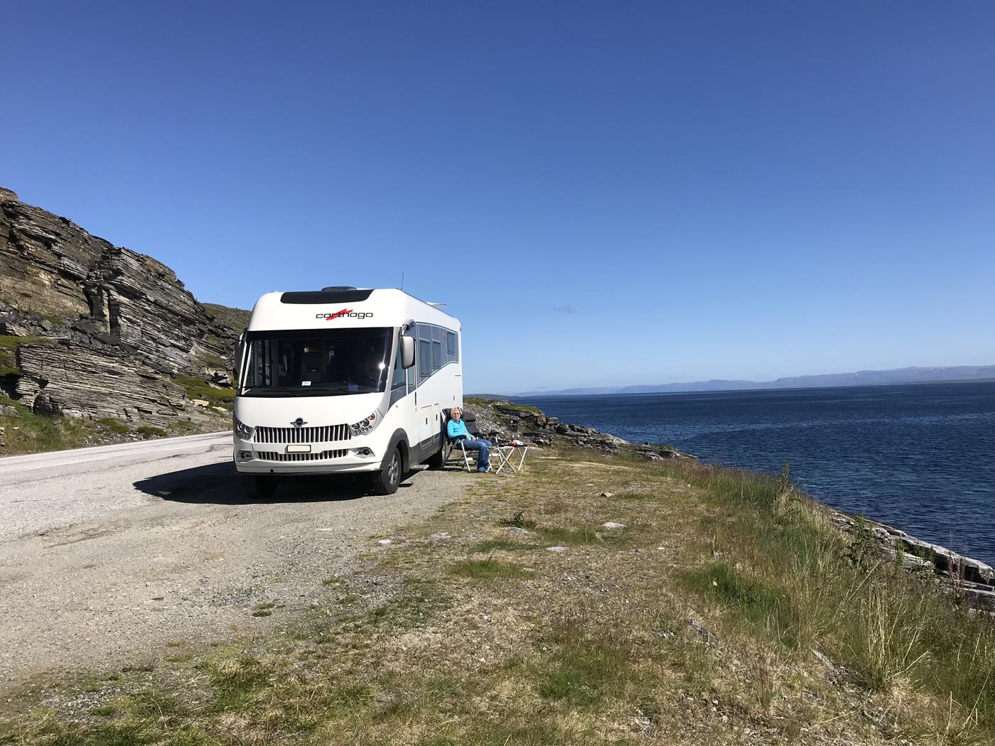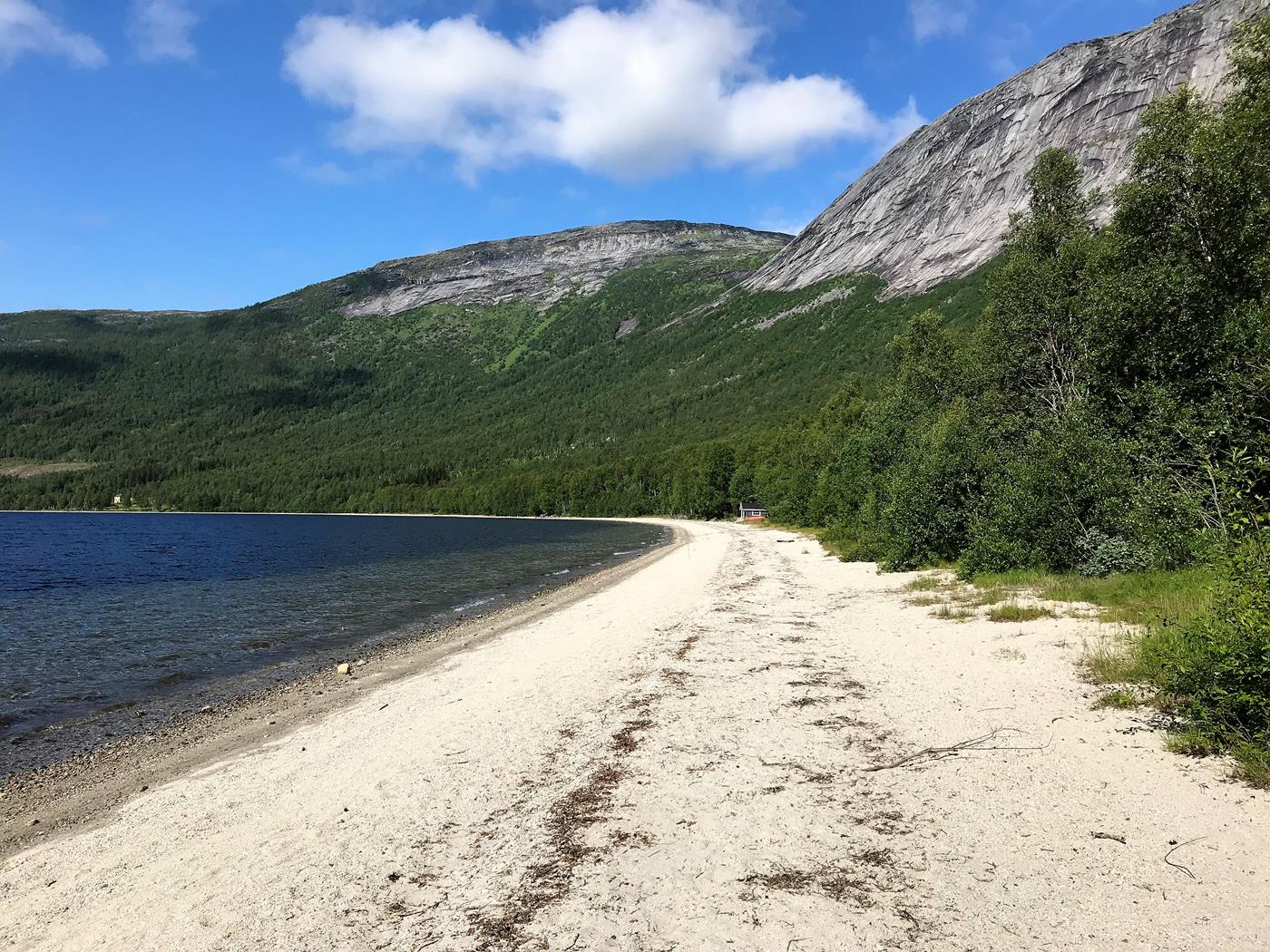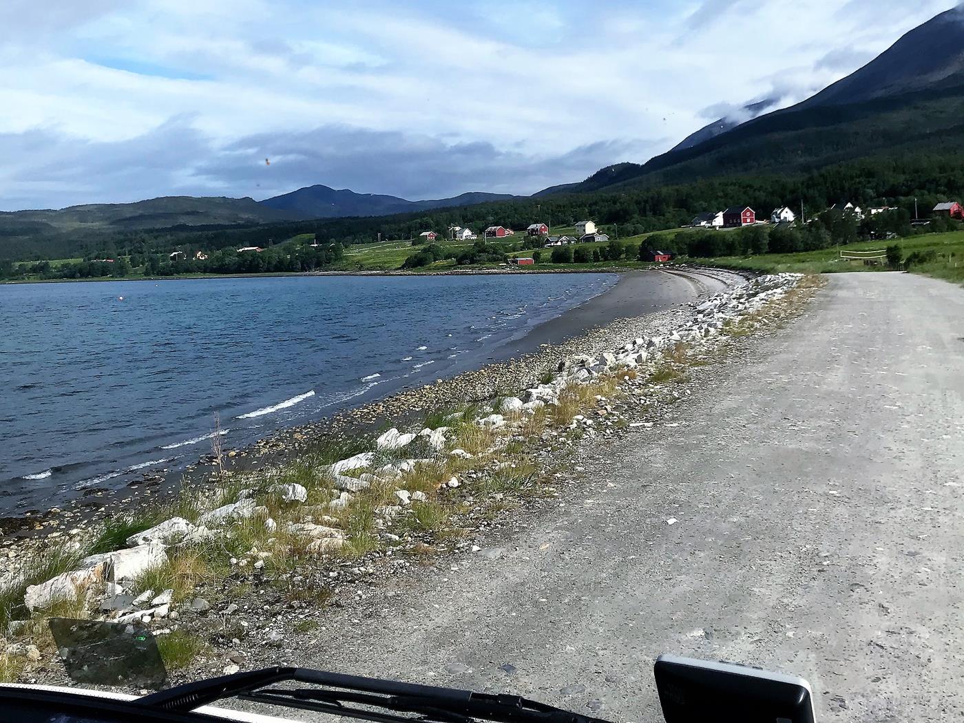 Auf dem Weg sehen wir noch Strände, die uns glauben machen, dass wir uns im Süden befinden würden. Kurz vor Dalselv finden wir einen geeigneten Übernachtungsplatz am Strassenrand. Wir kochen ein feines Abendessen und geniessen die Sonne, die sich wieder zeigt.