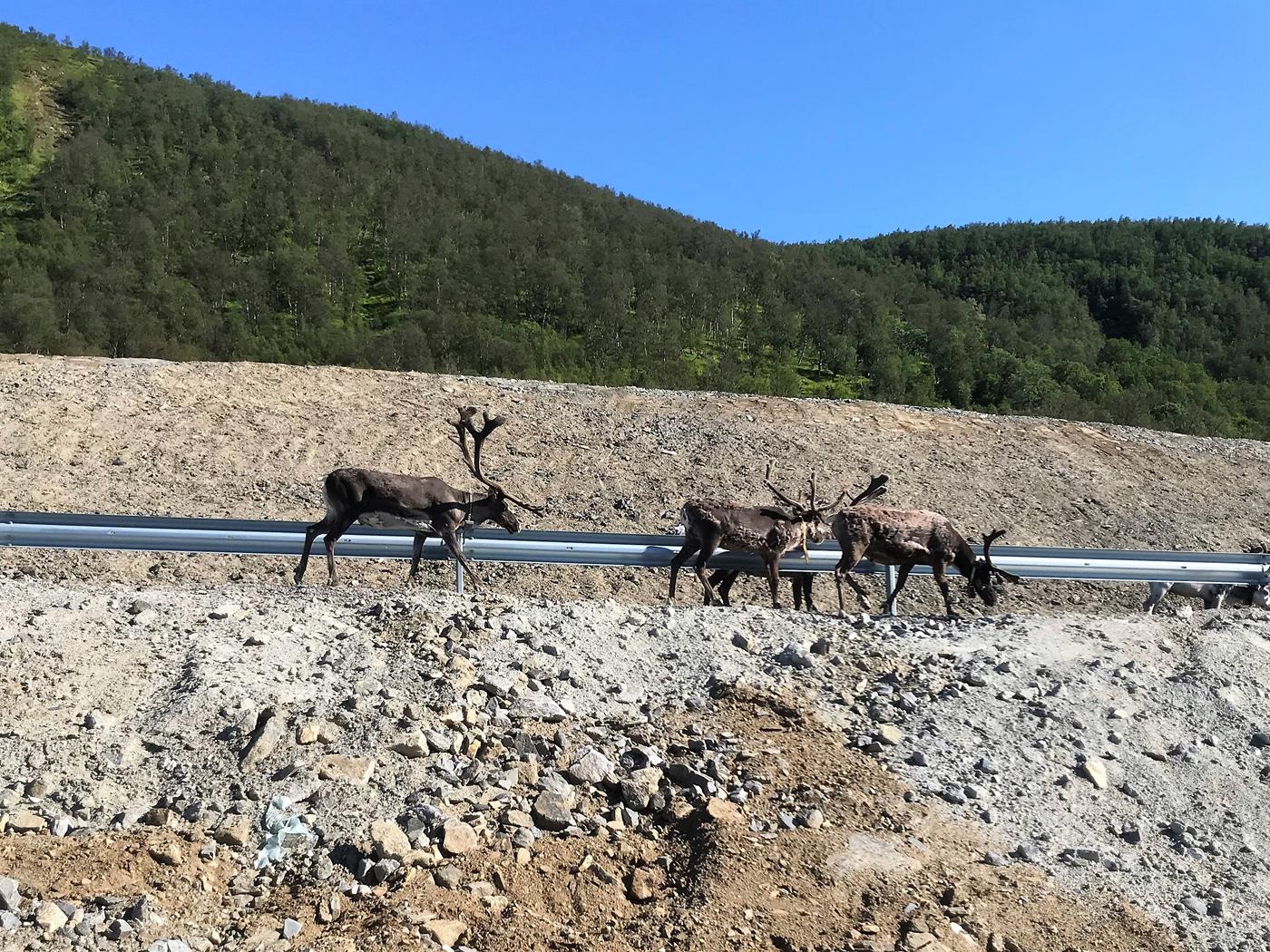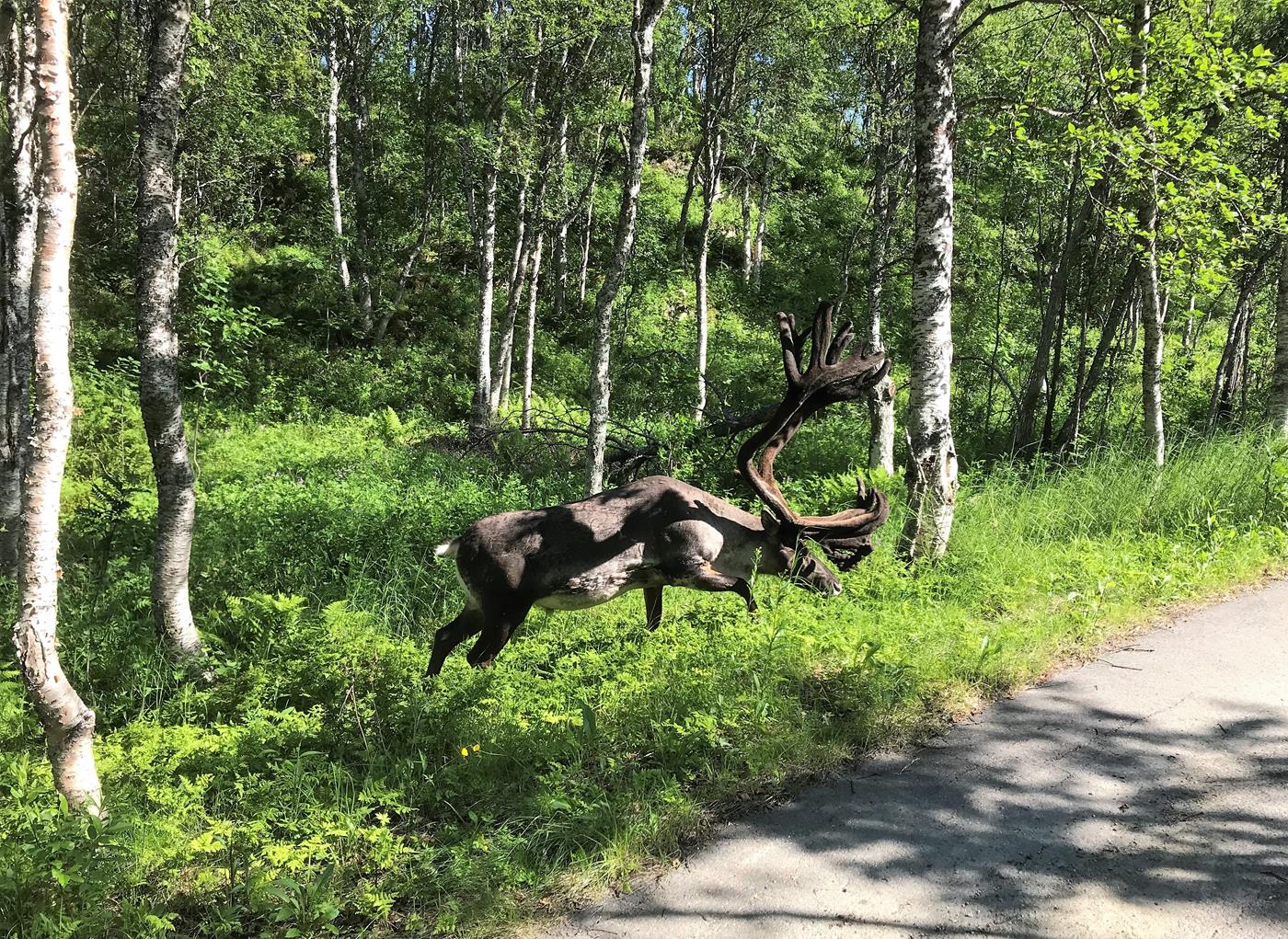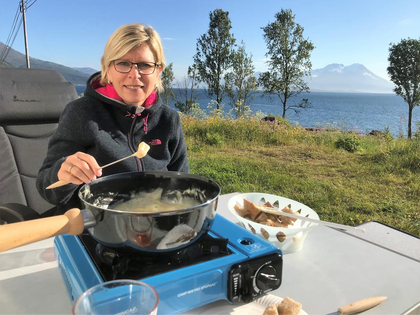 Unterwegs sehen wir am Strassenrand noch einige Rentiere. Bei Nordmannsvik finden wir ein lauschiges Plätzchen am Wasser wo wir übernachten können. Bei einem Fondue geniessen wir hier den Sonnenschein.