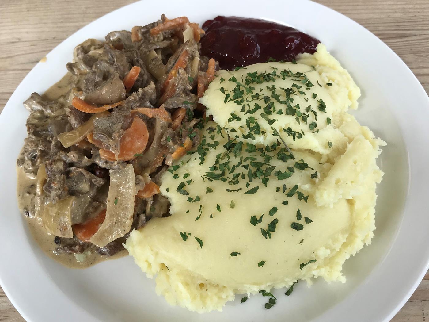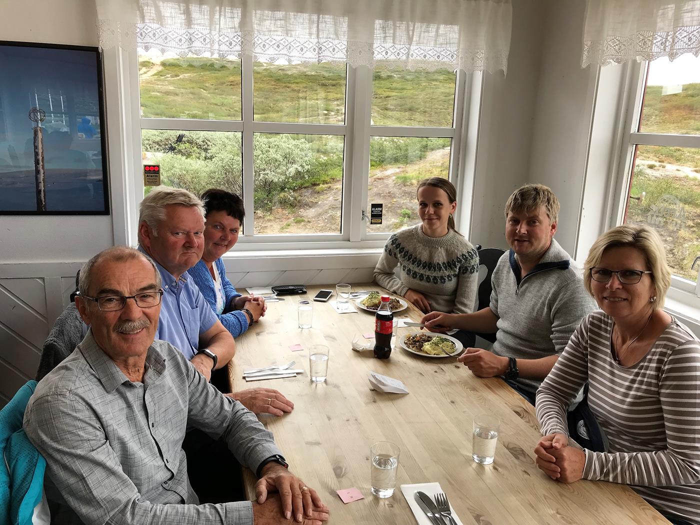Tove und Geir wollen nach der Besichtigung des Polarkreises leider wieder die Rückreise antreten. Wir prüfen die Wetterprognosen für die folgenden Tage am Nordkap. Diese sehen gut aus und so entschliessen wir uns weiter zum Nordkap zu fahren, es sind ja nur noch so ca. 1100km. Im Restaurant geniessen wir Rentiergeschnetzeltes mit Kartoffelstock und Tyttebaer.Nach dem gemeinsamen Essen machen wir uns nun allein auf den Weg Richtung Nordkap. Um 18:30Uhr parkieren wir in der Nähe von Straumen auf einem Parkplatz mit schöner Aussicht. Da es ruhig ist, entscheiden wir uns hier zu übernachten.
