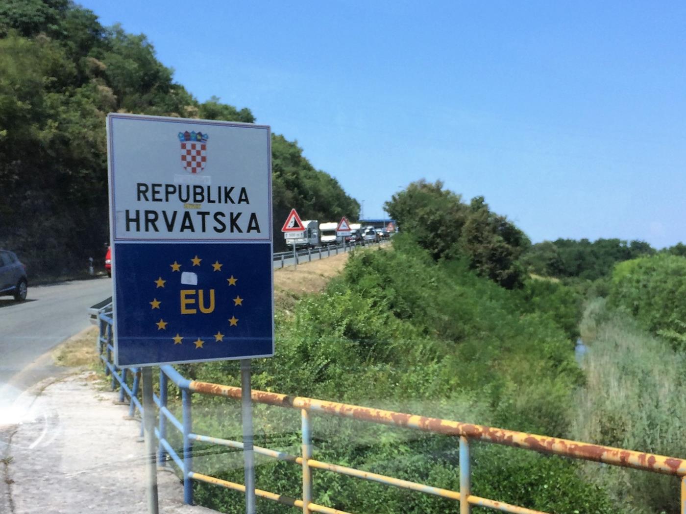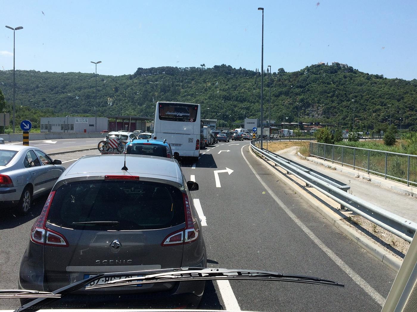 Nach dem Tanken in Koper gibt es auch dieses Jahr einen langen Stau vor dem Grenzübergang Slowenien/Kroatien. Slowenien ist die EU-Aussengrenze und kontrolliert alle Fahrzeuge und Insassen. Danach können wir aber staufrei bis zum Campingplatz Polari fahren wo uns unsere Freunde Tove und Geir aus Norwegen schon erwarten.