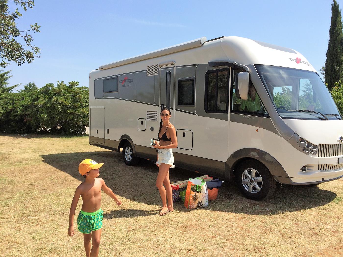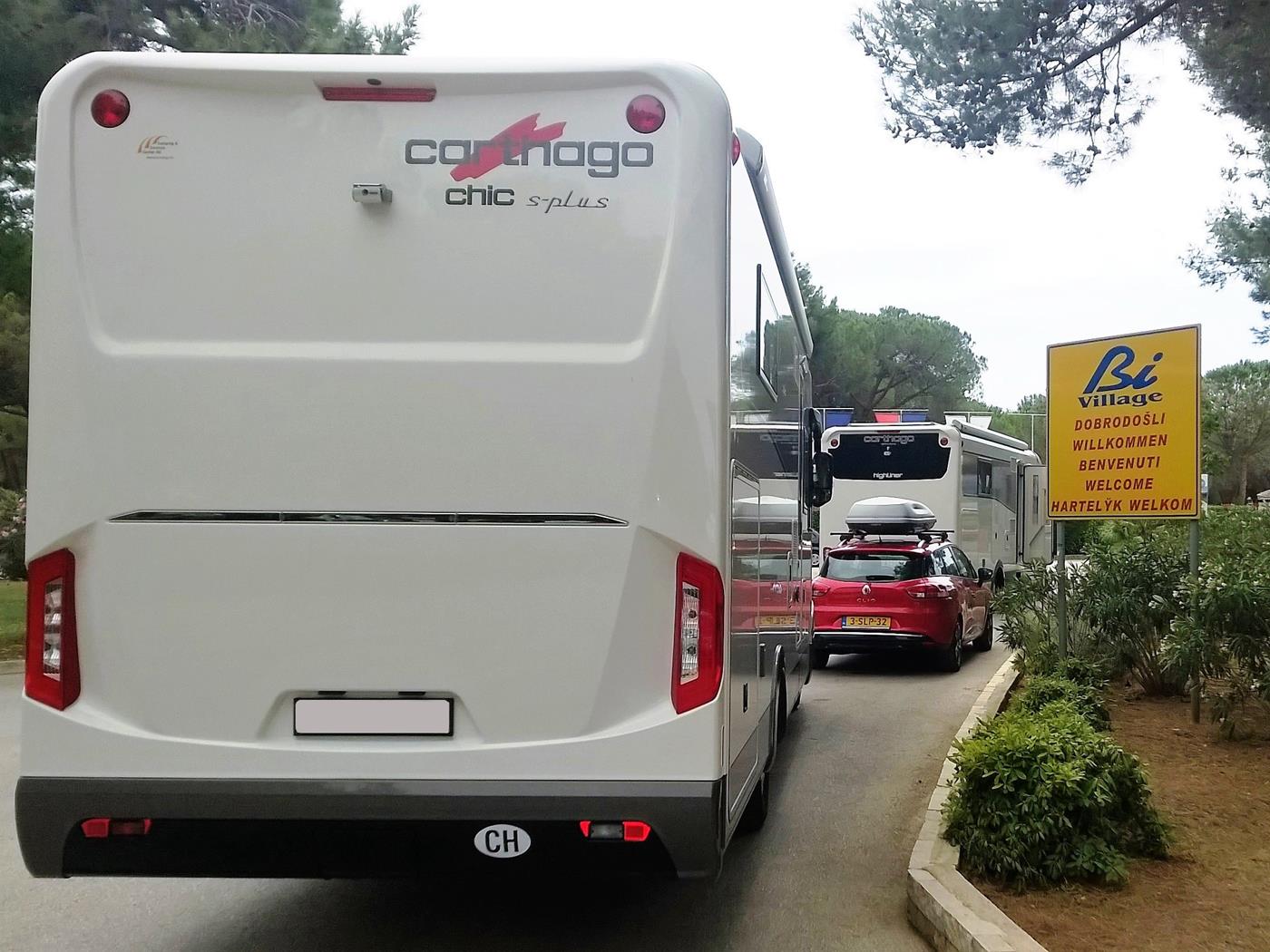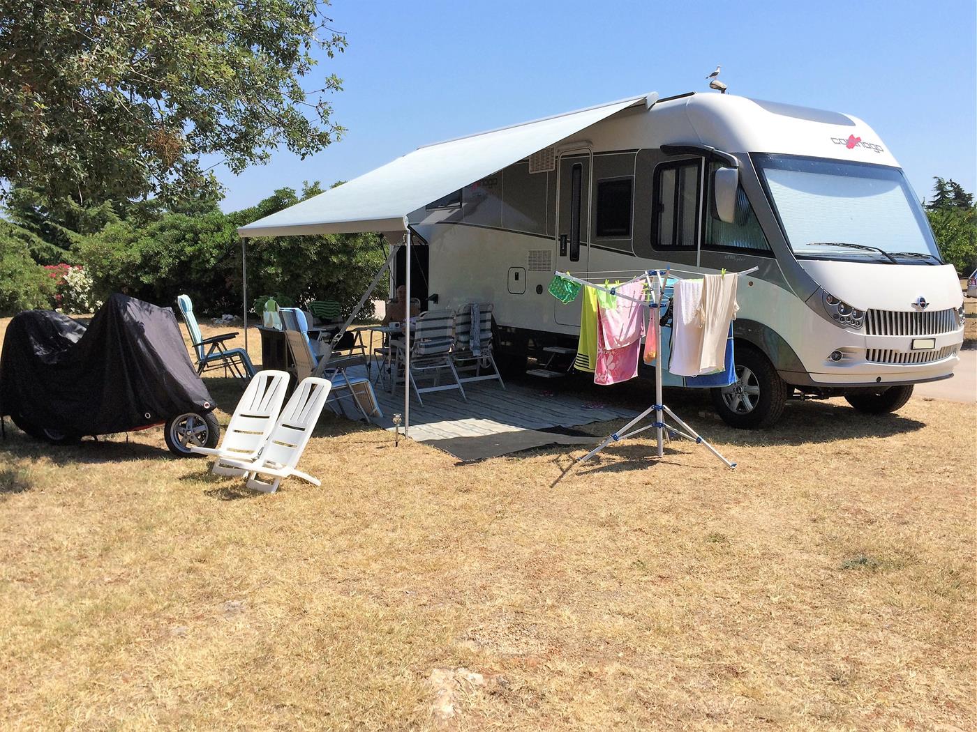 Jetzt geniessen wir das schöne und heisse Wetter auf dem Campingplatz Polari in Rovinj.Ich studiere die rund 6kg schwere Dokumentation, die zum Wohnmobil gehört. Unklarheiten kann ich glücklicherweise mit Geir diskutieren, der einen Carthago Highline hat und sich sehr gut in den technischen Details auskennt.Da wir schon einige heftige Stürme erlebt haben, ziehen wir die Markise jetzt lieber frühzeitig ein, denn diese ist markant grösser als bei unserem alten Wohnmobil. Wenn es dann beim Kochen regnet, muss halt ein provisorischer Regenschutz daher.Später kommen auch unsere italienischen Freunde Giorgio und Marta auf dem Campingplatz an und wir verbringen einen schönen Abend zusammen. Samstag 16.07.2016 – Mittwoch, 20. 07.2016 Rovinj – CP BiVillage, Fazana