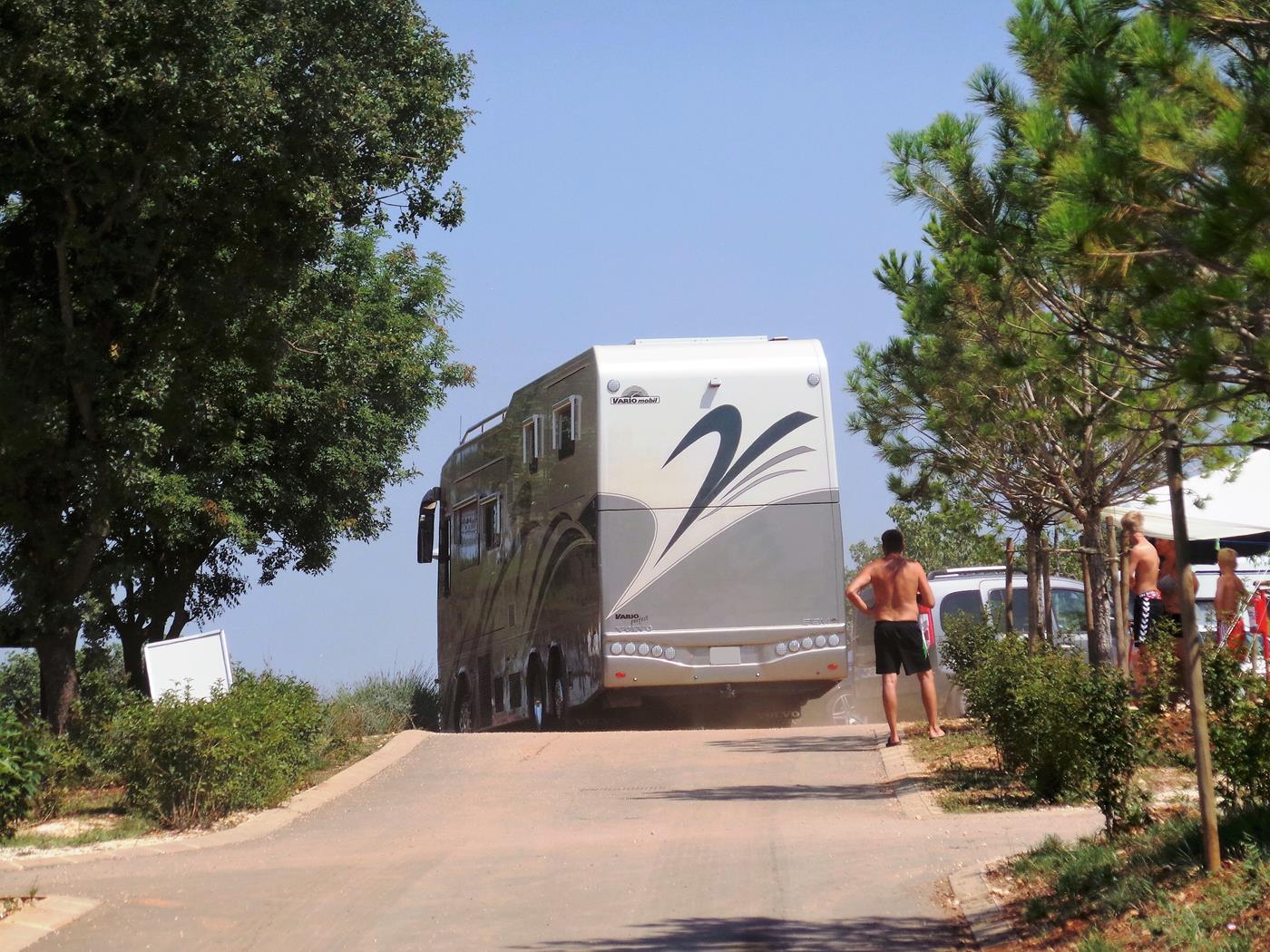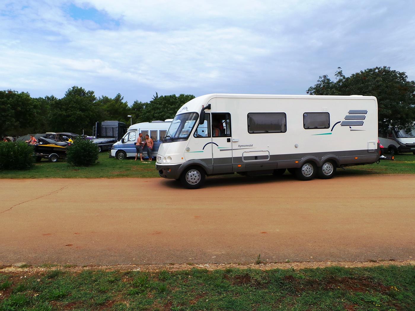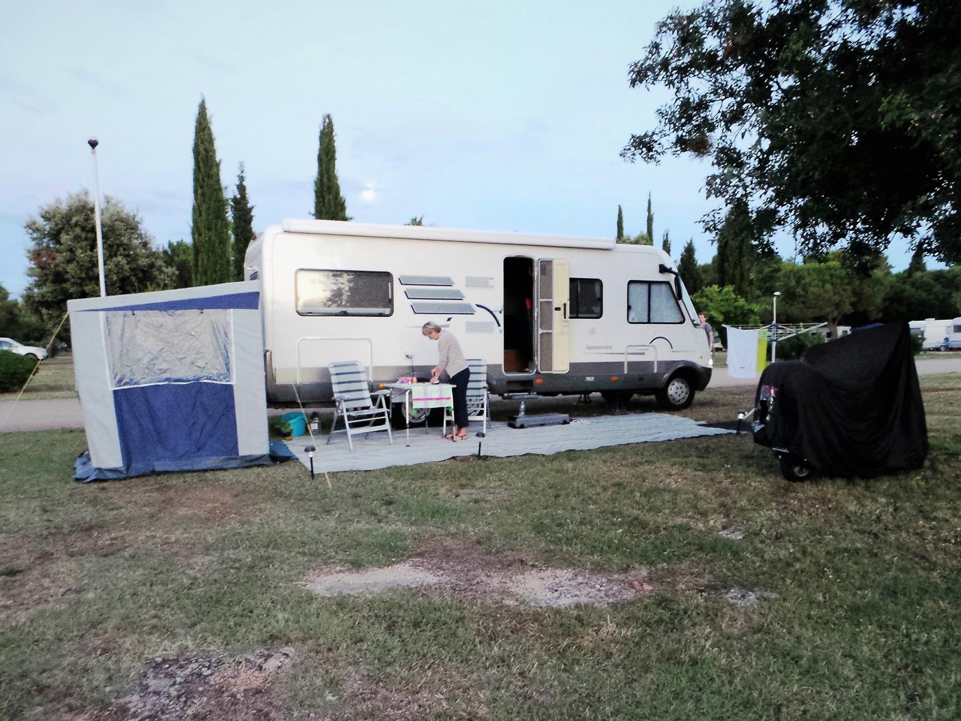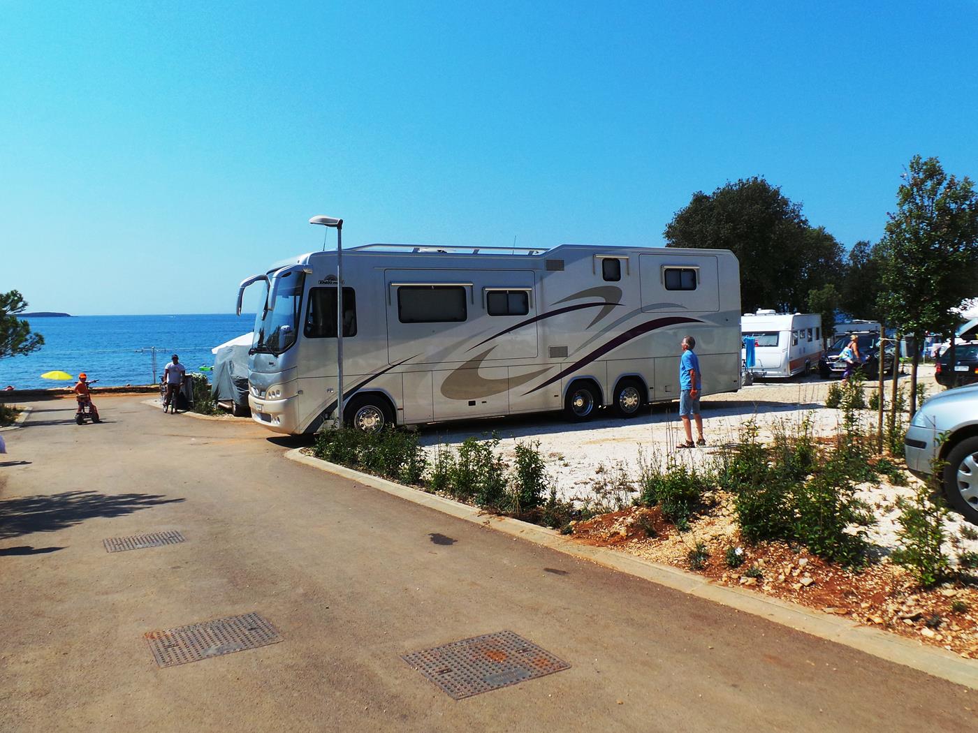 Um 16:00Uhr kommen wir auf dem Campingplatz Polari in Rovinj an. Wir nehmen wieder den schönen Platz auf der nicht parzellierten Fläche gleich beim Eingang, welcher zum Glück noch frei ist. Ich freue mich riesig, dass in der Nähe ebenfalls zwei Doppelachser stehen…