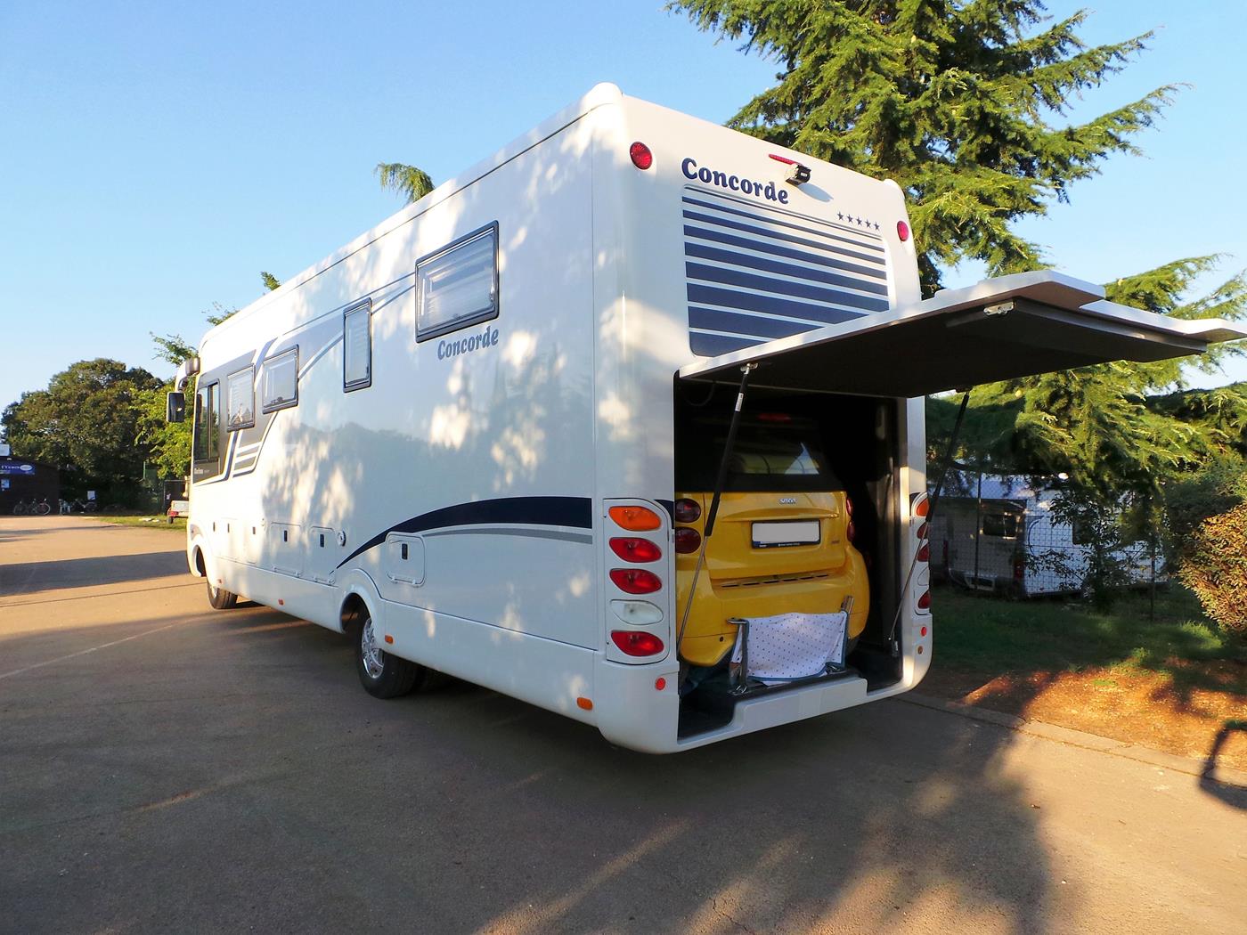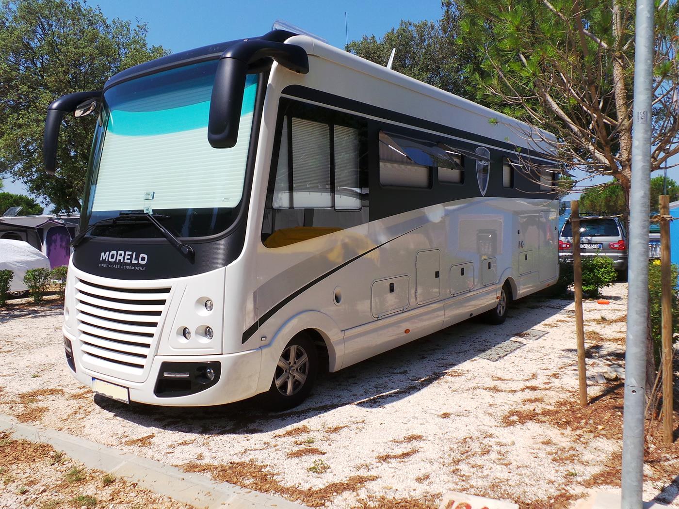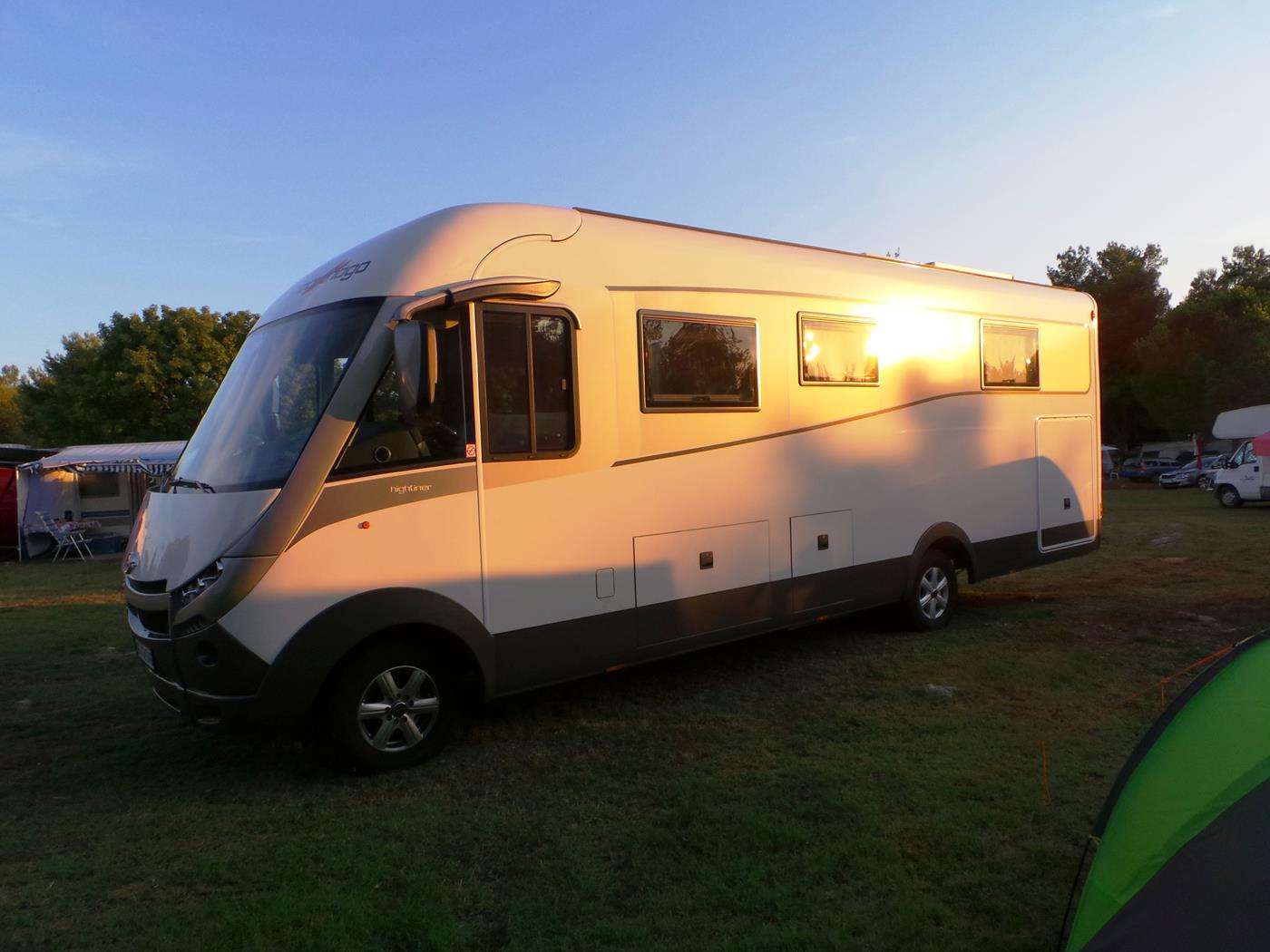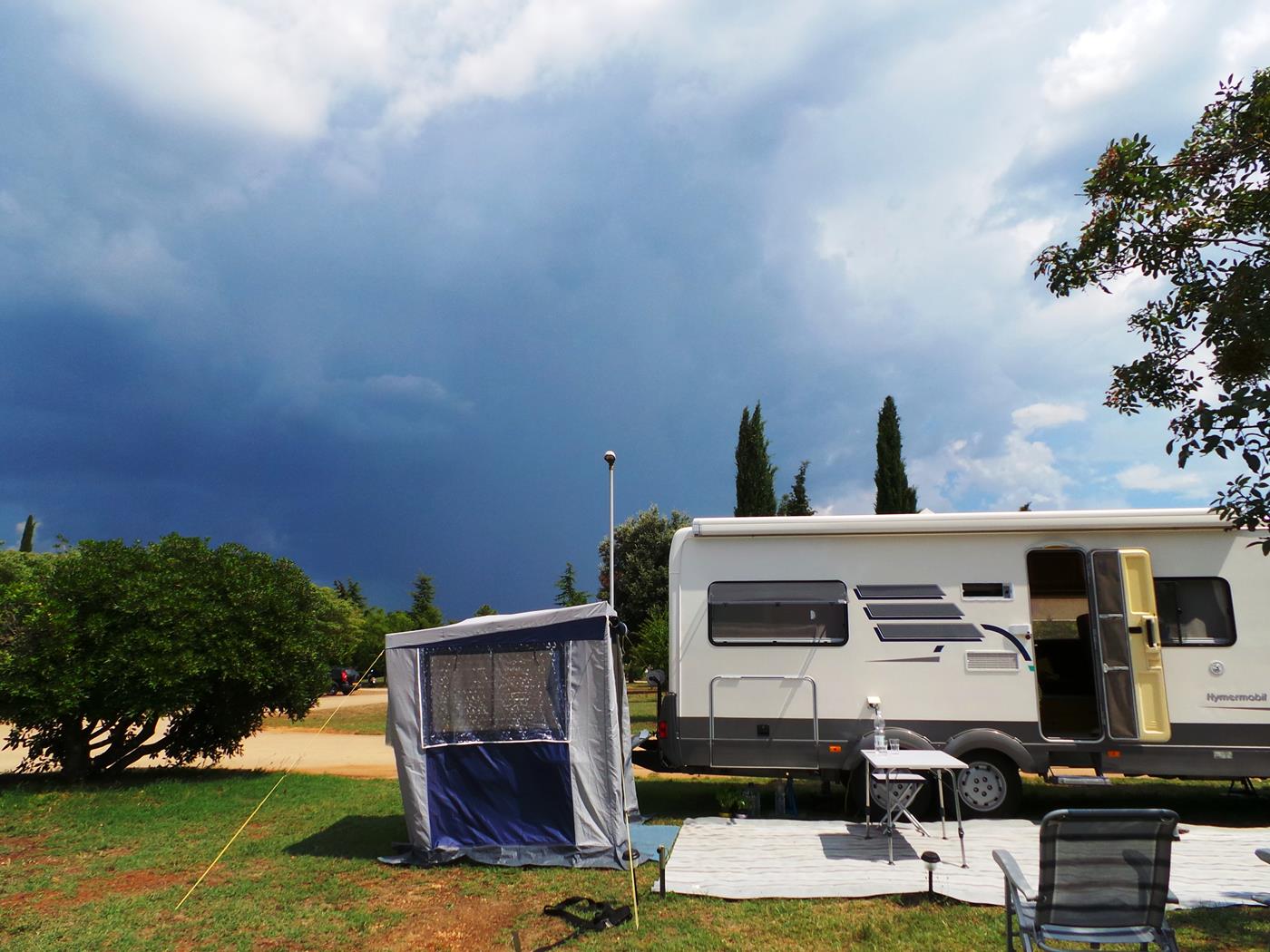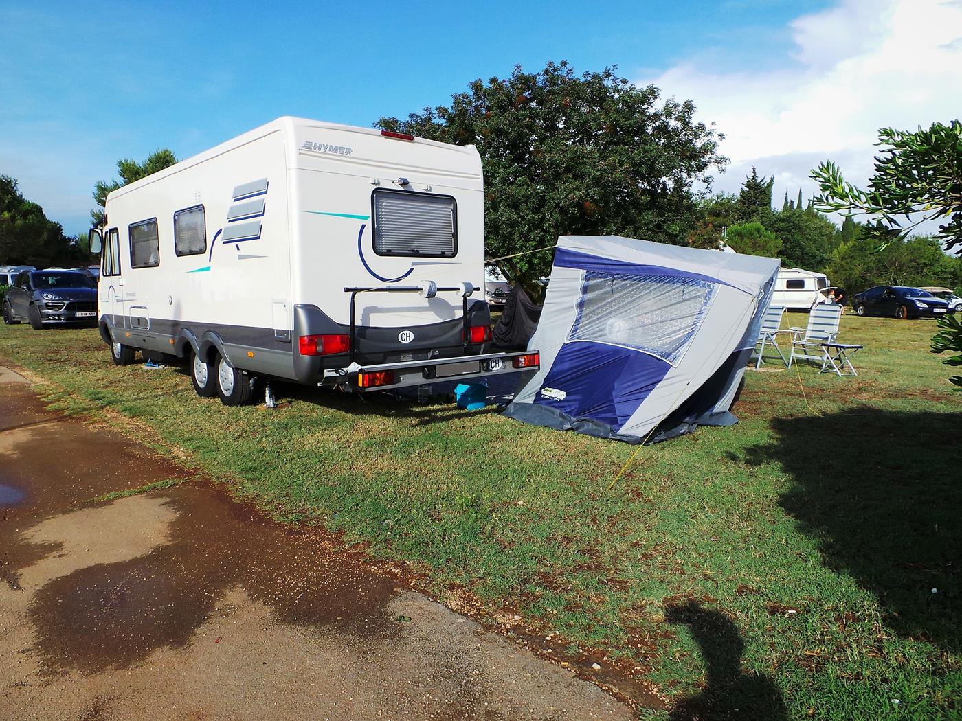 Um 16:00Uhr kommen wir auf dem Campingplatz Polari in Rovinj an. Wir nehmen wieder den schönen Platz auf der nicht parzellierten Fläche gleich beim Eingang, welcher zum Glück noch frei ist. Ich freue mich riesig, dass in der Nähe ebenfalls zwei Doppelachser stehen…
