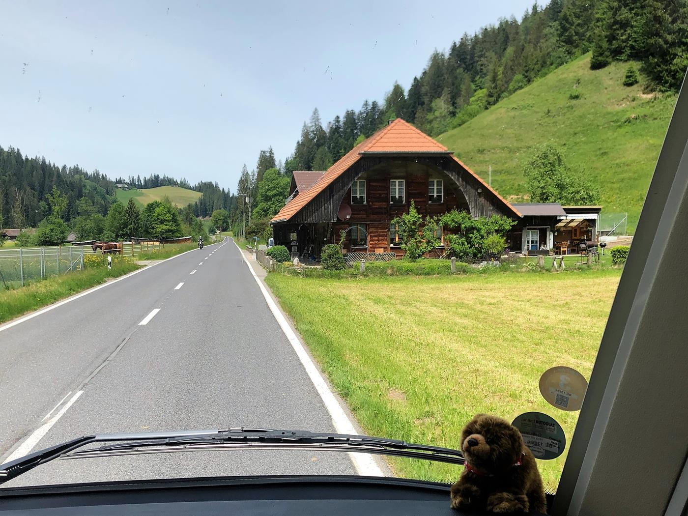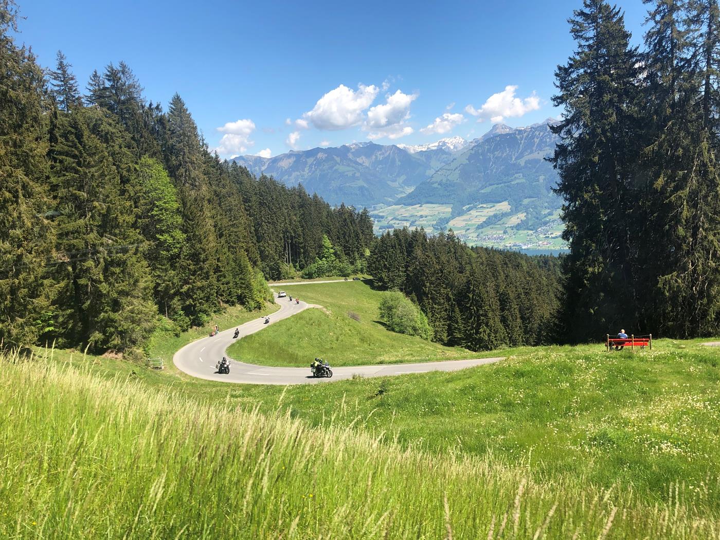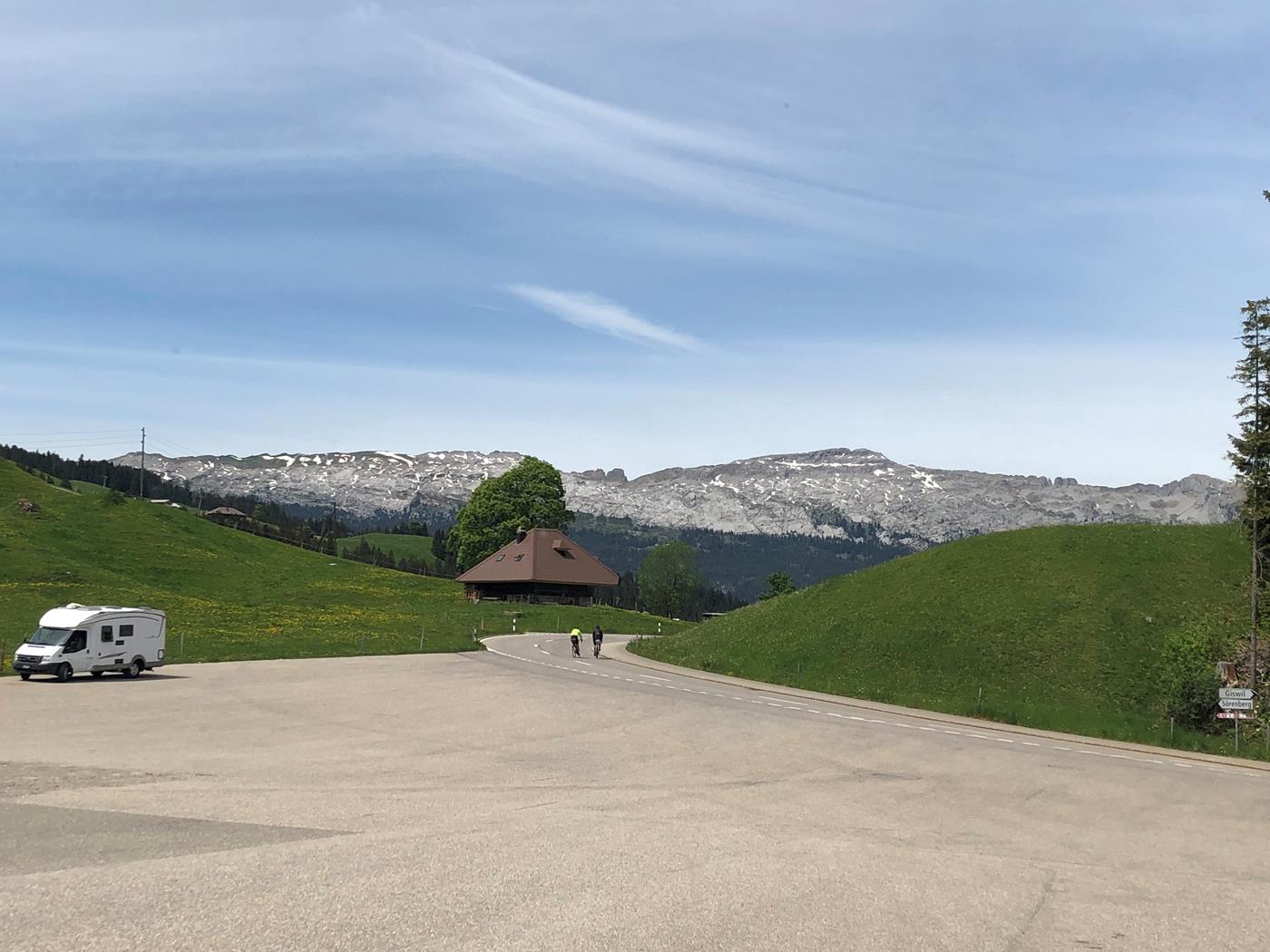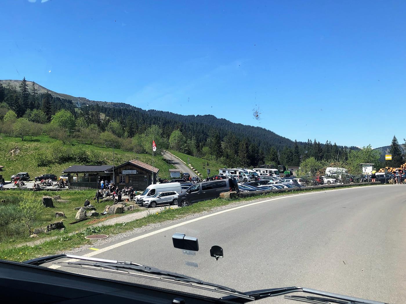 Frisch gestärkt fahren wir auf der Panoramastrasse Richtung Glaubenbergpass. Die Passstrasse ist seit 7. Mai geöffnet und es sind sehr viele Motorradfahrer unterwegs. Die Parkplätze unterwegs sind rappelvoll und natürlich auch der Parkplatz beim Passhöchi Beizli auf 1543 m ü.M. Wir versuchen trotzdem einen Platz zu ergattern, was uns glücklicherweise gelingt.