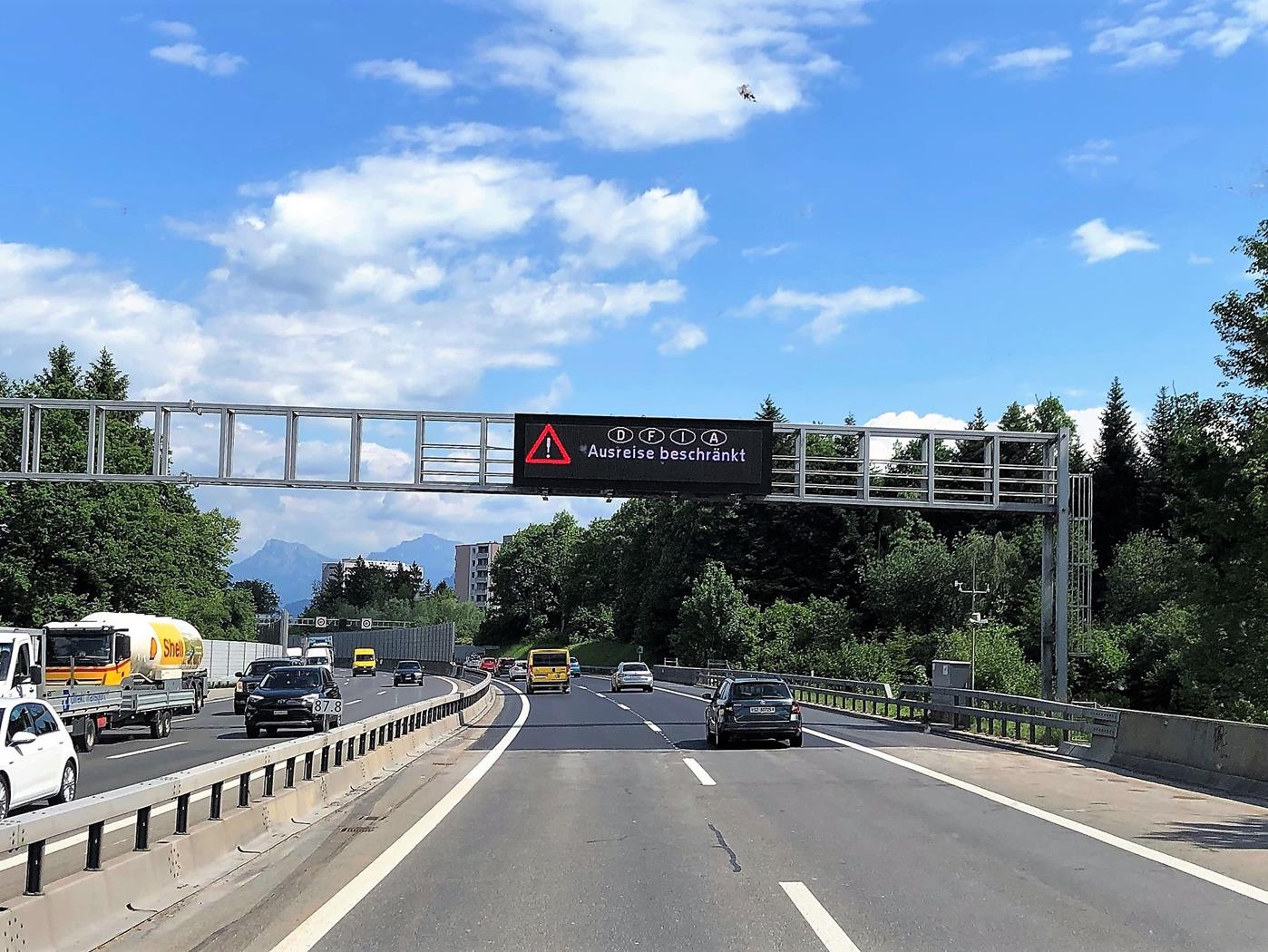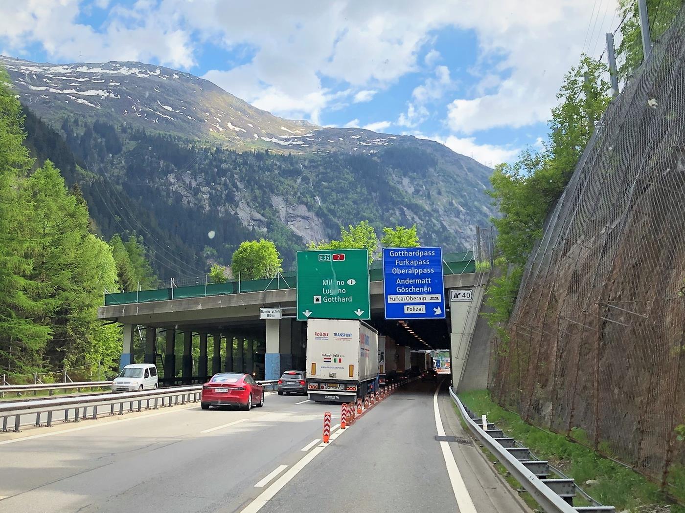 Wir sind überrascht, dass es auf der A1 Bern-Zürich so viel Verkehr hat. Es gibt zwar keine Staus, aber wir hätten wegen der Corona-Situation eher eine halbleere Autobahn erwartet. Auf der A2 (Gotthardroute) ist es dann wie erwartet sehr ruhig. Ein Novum sind die Warnanzeigen Ausreise beschränkt, denn wegen der Corona-Beschränkungen sind Auslandfahrten noch tabu, daher hat es auch vor der Einfahrt zum Gotthardtunnel keinen Stau.