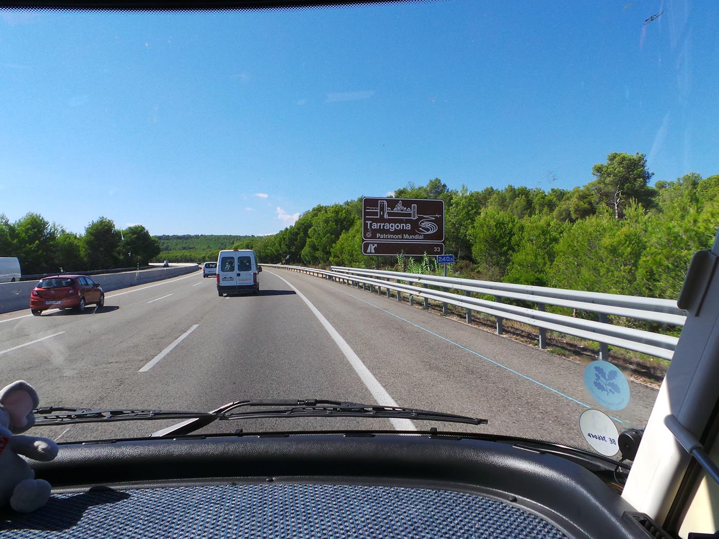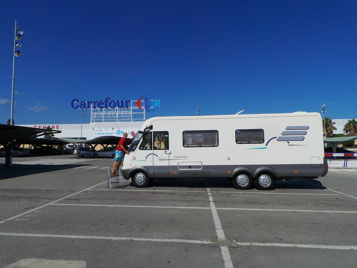 Im Carrefour in Tarragona kaufen wir ein und reinigen die Frontscheibe damit wir mit einem sauberen Wohnmobil auf dem Campingplatz einfahren können.