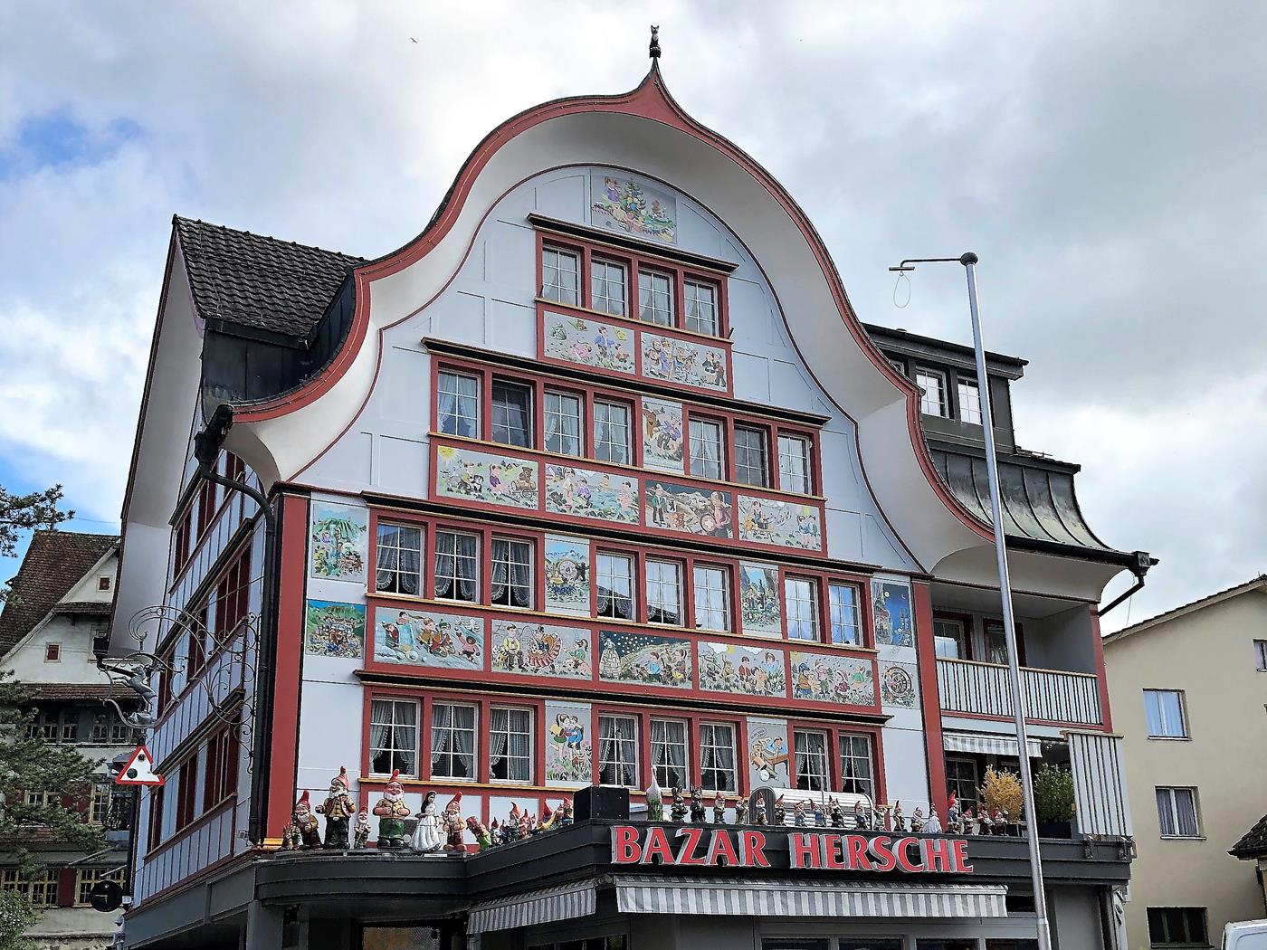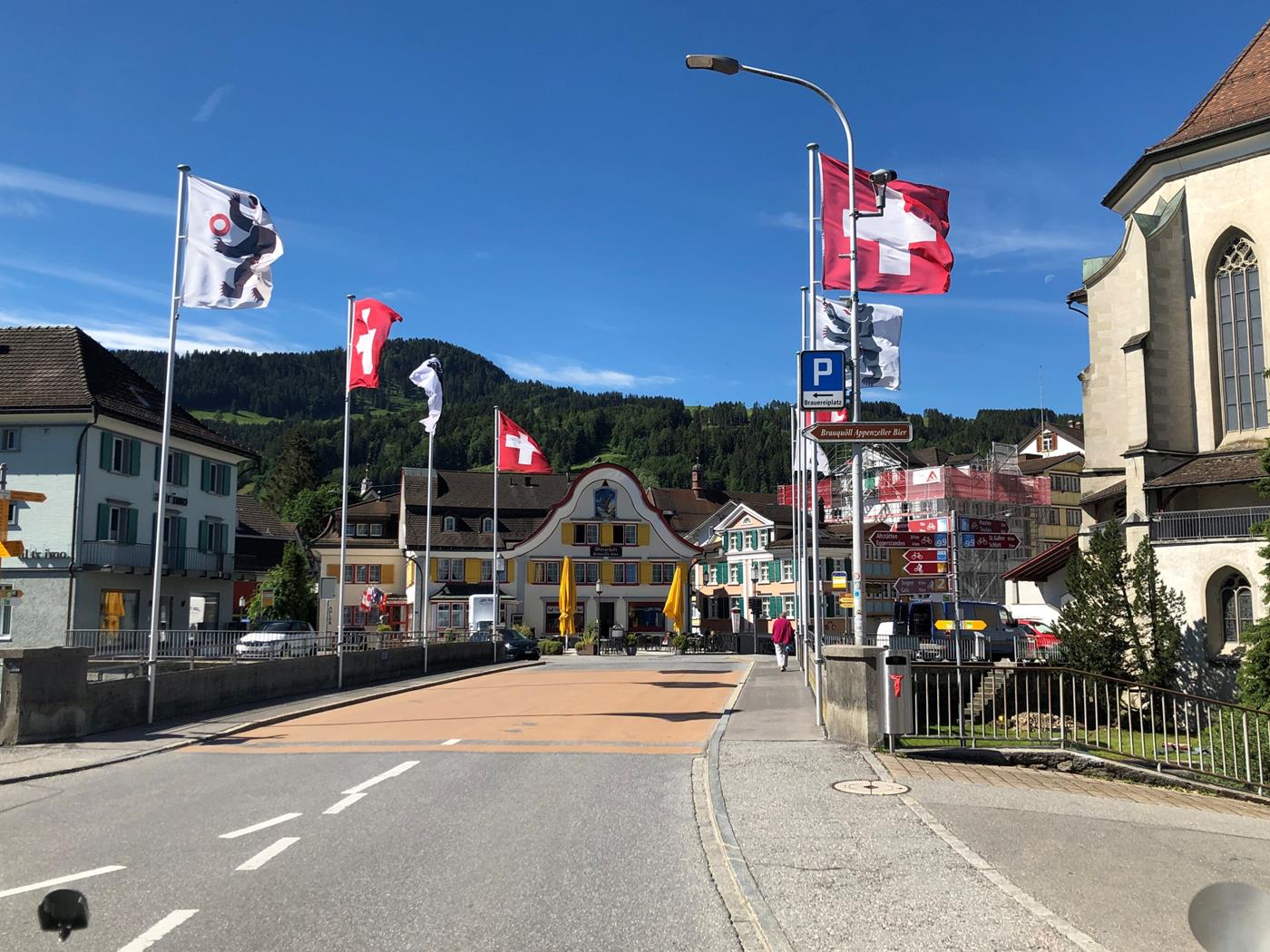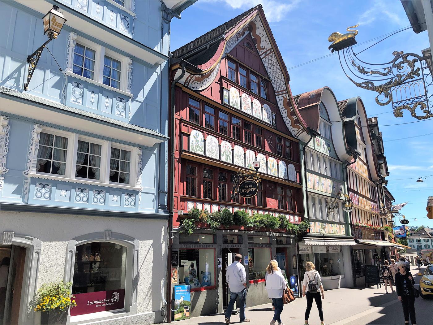 Wir besichtigen die prachtvolle Pfarrkirche St. Mauritius, welche dem heiligen Mauritius geweiht ist, dem Landespatron des Kantons Appenzell Innerrhoden. Dann schlendern wir entlang der Appenzeller Hauptgasse, wo die Häuser bis 1931 grau waren. Dann wurde als erstes die Fassade der Löwen-Drogerie rot bemalt und mit vielen Bildern von Heilkräutern versehen.