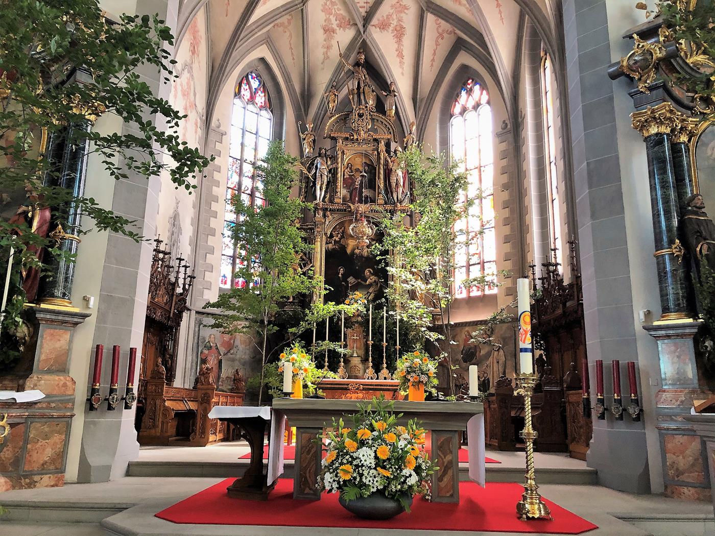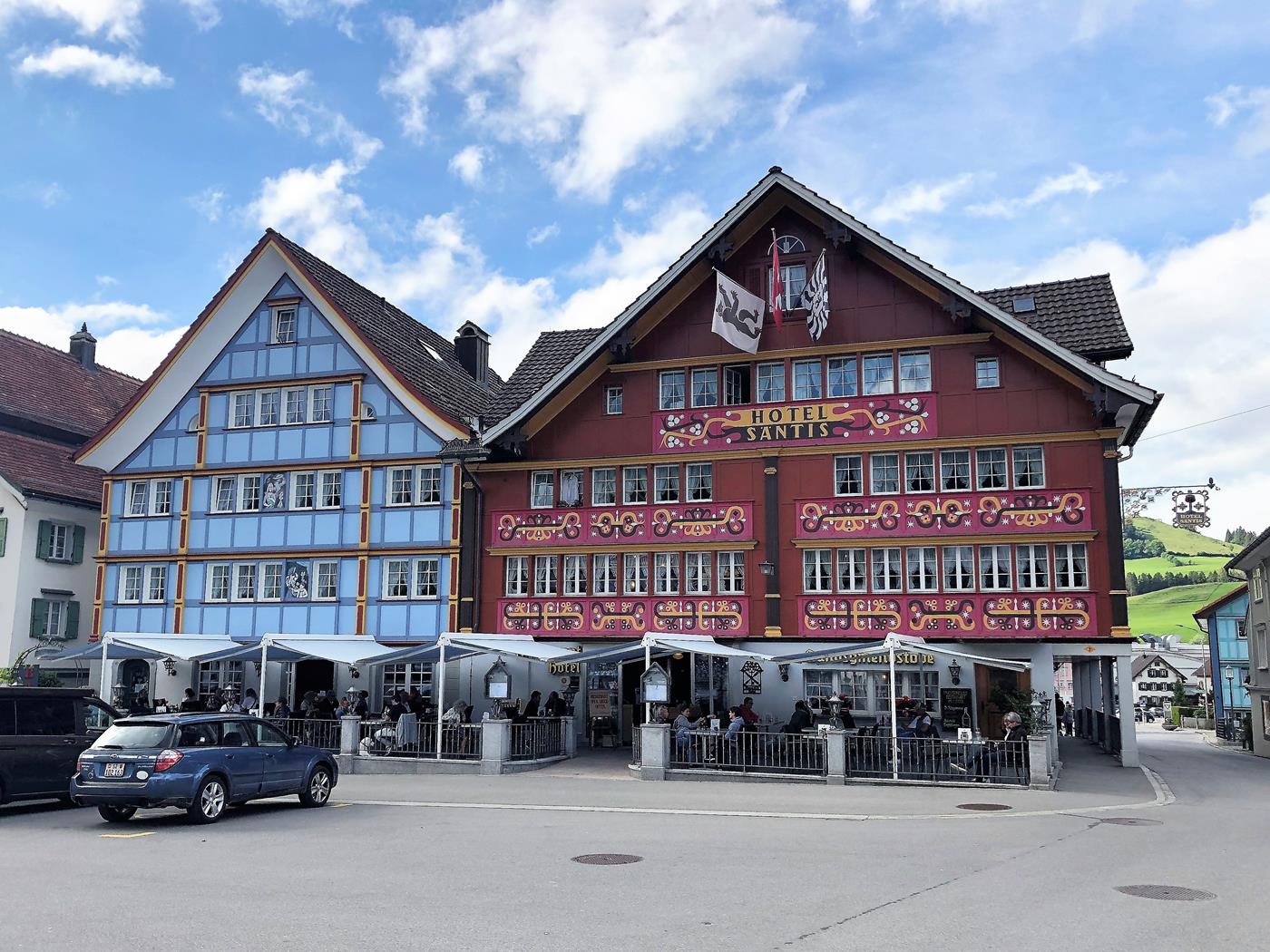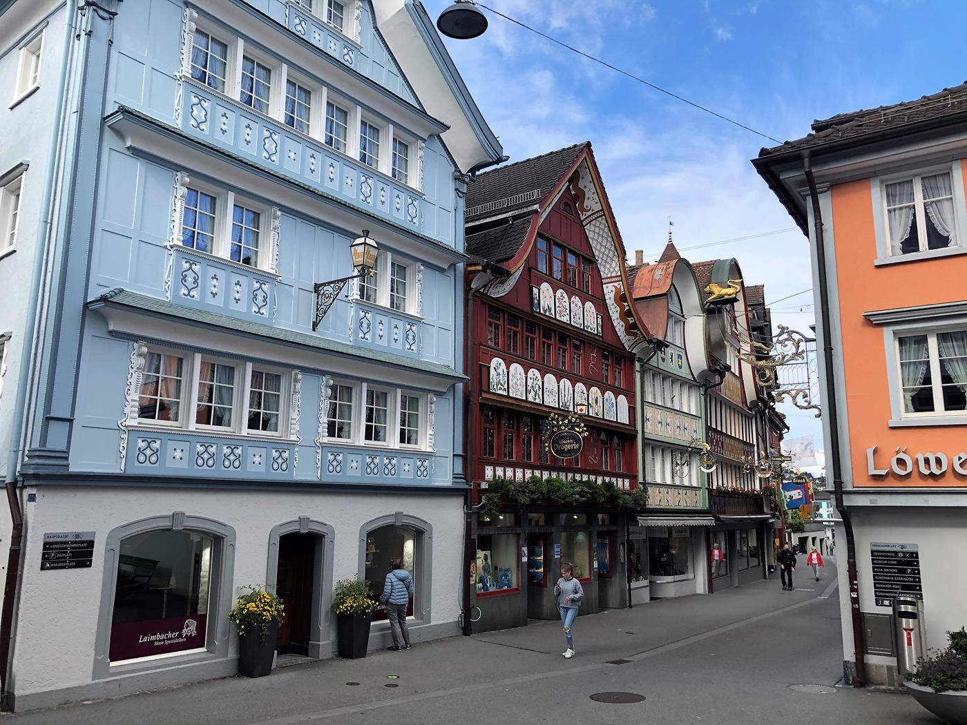 Wir besichtigen die prachtvolle Pfarrkirche St. Mauritius, welche dem heiligen Mauritius geweiht ist, dem Landespatron des Kantons Appenzell Innerrhoden. Dann schlendern wir entlang der Appenzeller Hauptgasse, wo die Häuser bis 1931 grau waren. Dann wurde als erstes die Fassade der Löwen-Drogerie rot bemalt und mit vielen Bildern von Heilkräutern versehen.