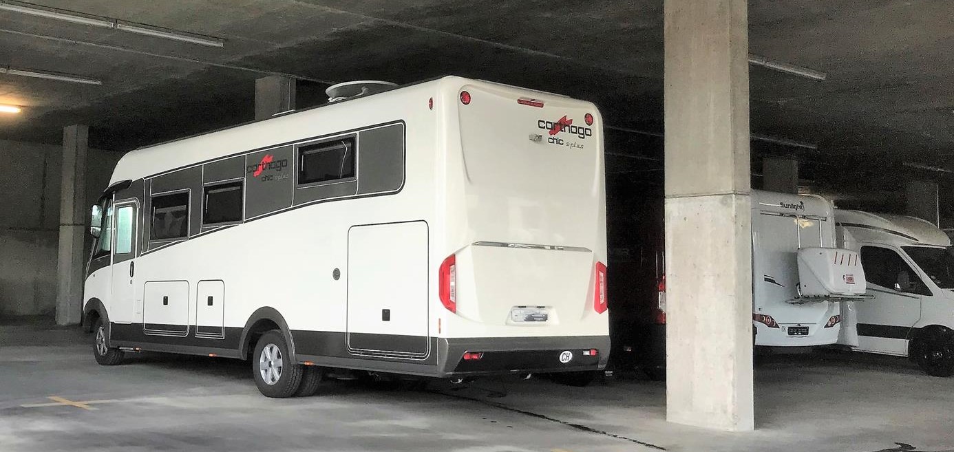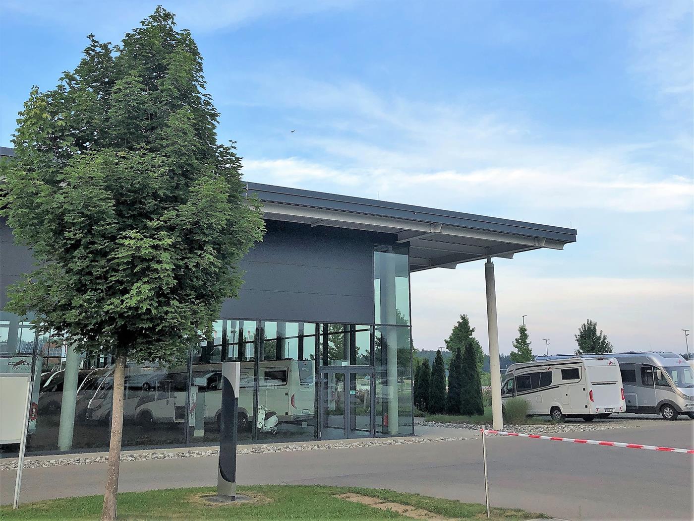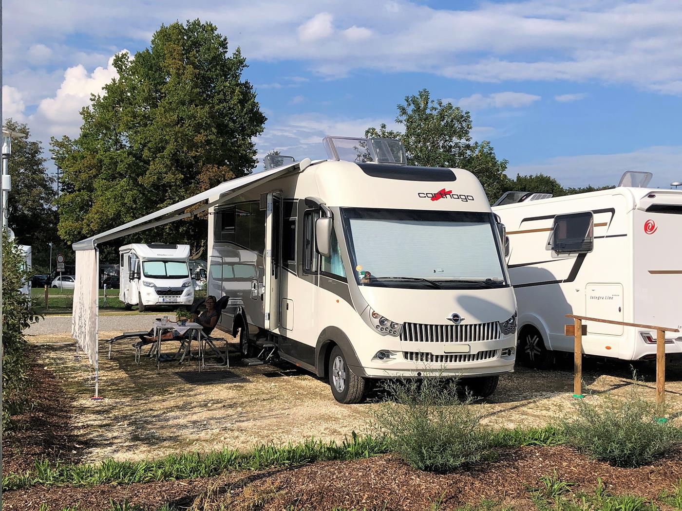 Unsere Campingstühle benötigen wir nicht – es regnet und wir bleiben bei Carthago im Aufenthaltsraum. Wir schauen uns die Verkaufsausstellung an und stellen fest, dass es nichts wirklich Neues gibt und wir mit unserem s-plus sehr gut gewählt hatten. Bei einer Regenpause schauen wir dem Verlad der neuen Carthago Wohnmobilen zu.
