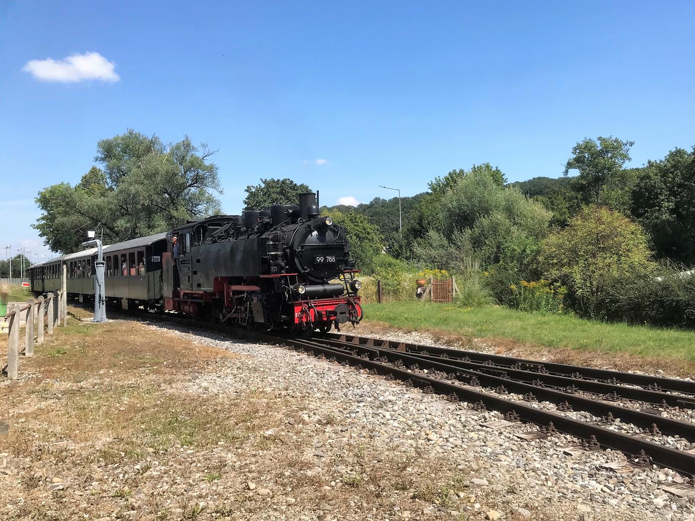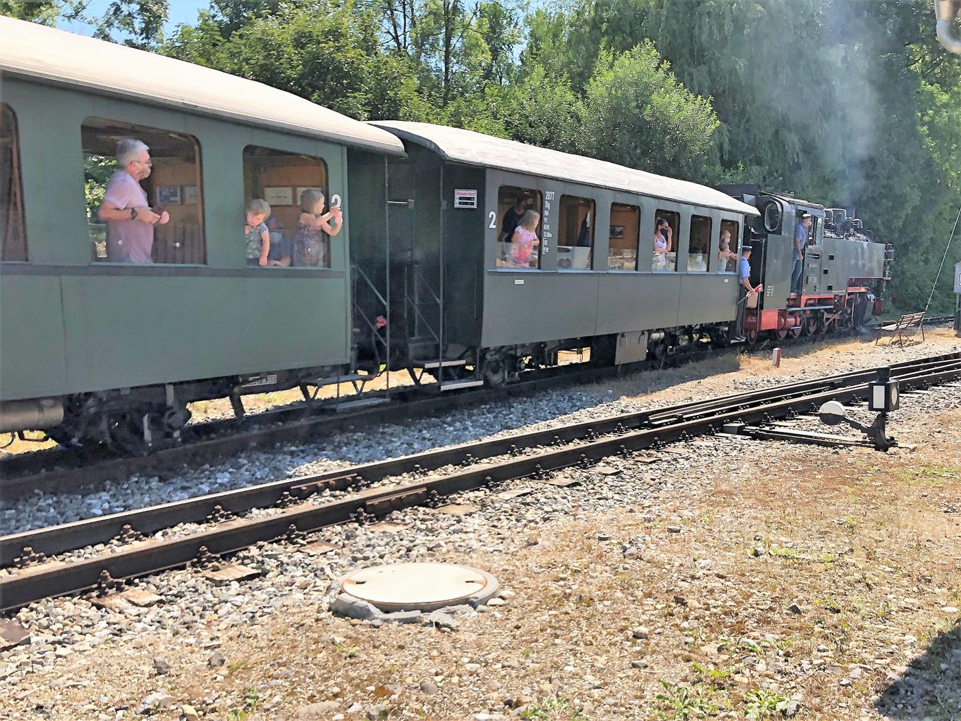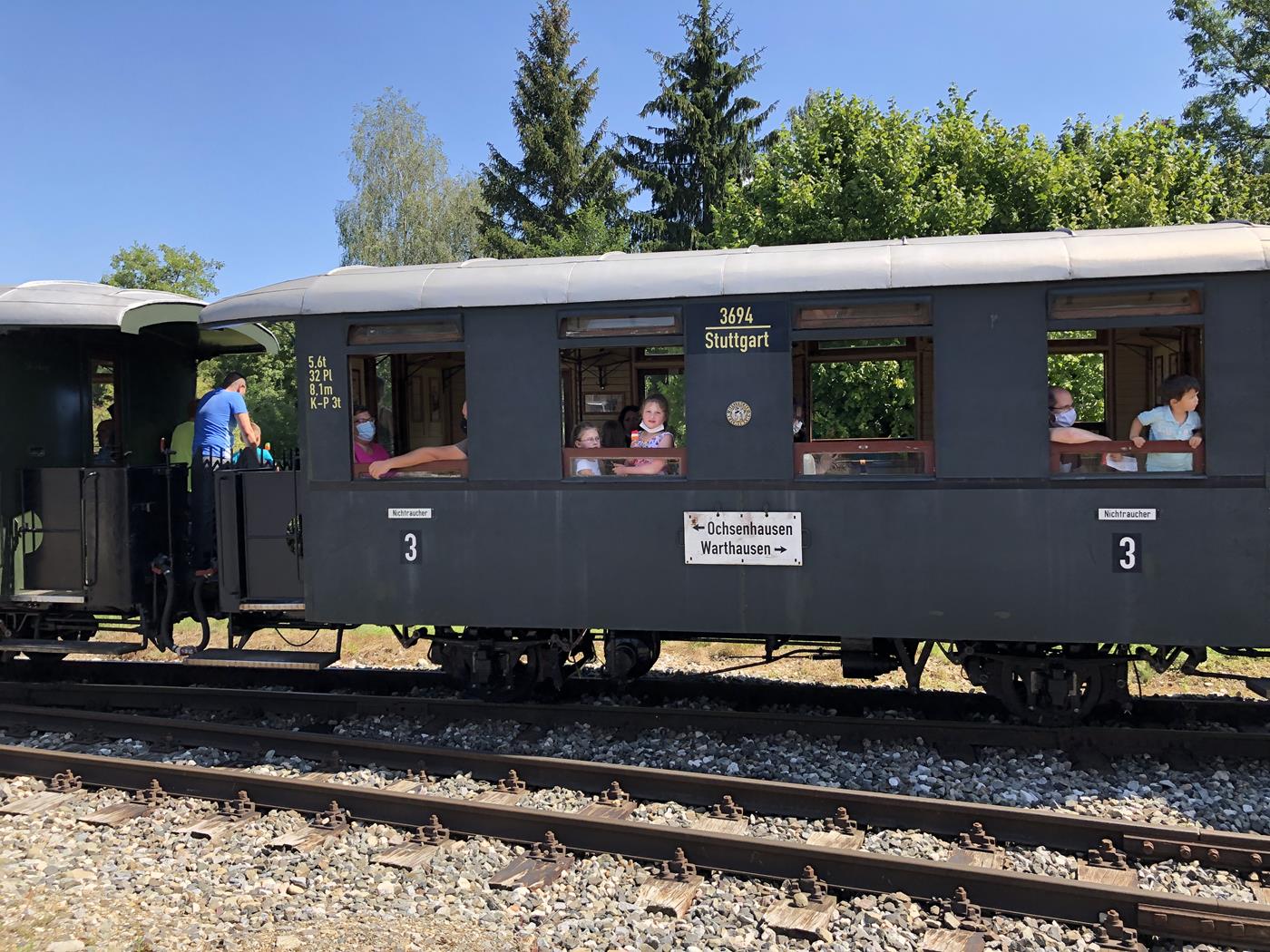 Unterwegs stellen wir fest, dass irgendwo eine Dampflokomotive unterwegs sein muss und glücklicherweise entdecken wir das Hinweisschild, das uns zum Parkplatz der Öchslebahn in Warthausen führt, wo wir auf das Eintreffen des Dampfzuges warten.