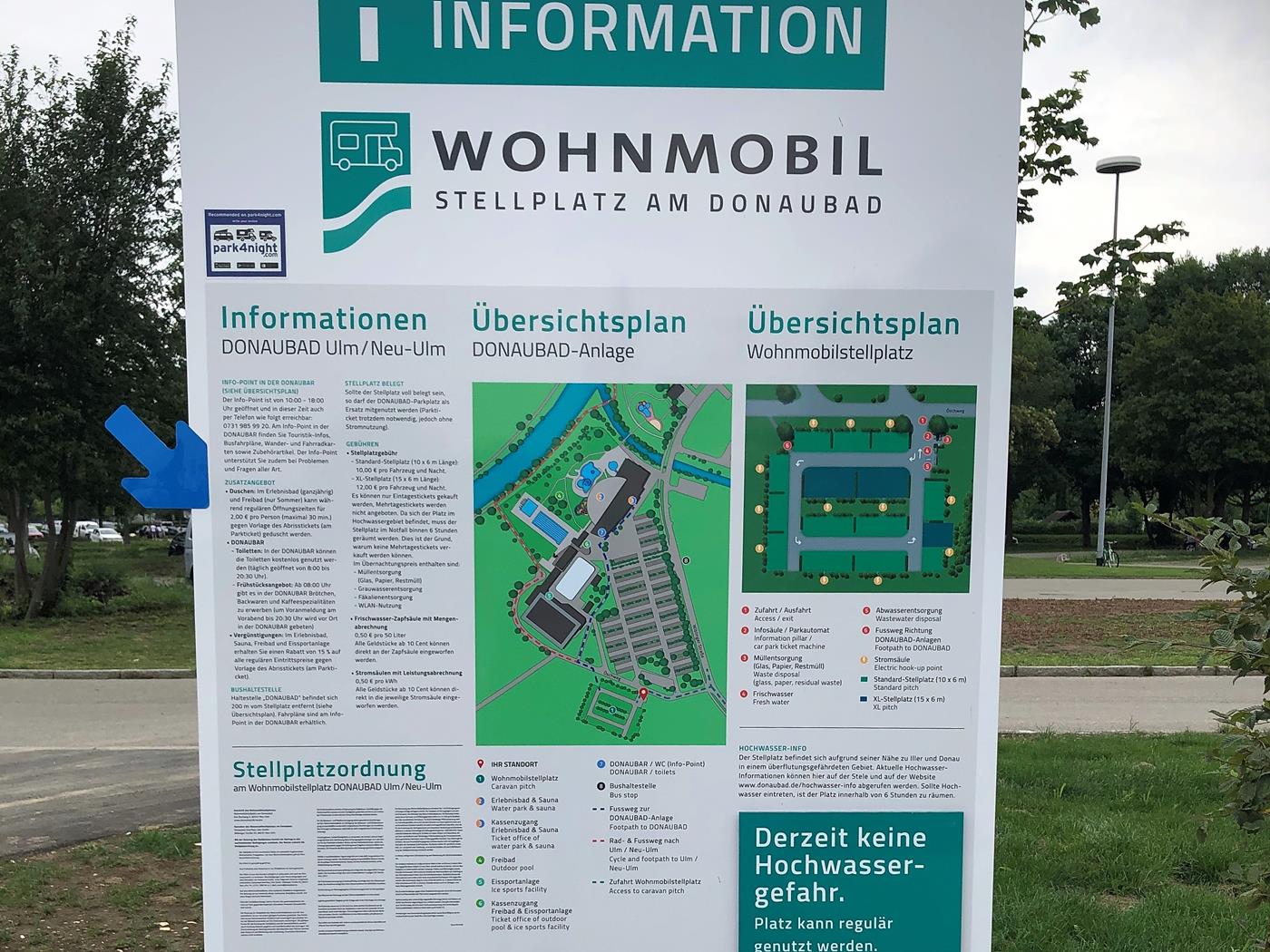 Wir geben im Navi die Route ein, auch den in der Broschüre erwähnte Reisemobilplatz Friedrichsau an der Wielandstrasse 74 in Ulm. Kurz vor dem Stellplatz sollten wir noch eine Brücke überqueren, leider ist die maximale Breite mit 2.10m angegeben und dies direkt vor der Brücke. Wir fahren rechts in eine Sackgasse wo uns ein nettes Pärchen erklärt, dass diese Einschränkung ganz neu sei, es aber einen neuen Stellplatz am anderen Ende der Stadt beim Donaubad geben würde. Wir geben Donaubad in unser Navi ein, blockieren den ganzen Verkehr bei der Brücke , da wir rückwärts über alle vier Spuren fahren müssen, damit wir von der Brücke wieder wegfahren können. Den Wohnmobilstellplatz am Donaubad finden wir problemlos, müssen dazu aber quer durch die Stadt Ulm fahren.