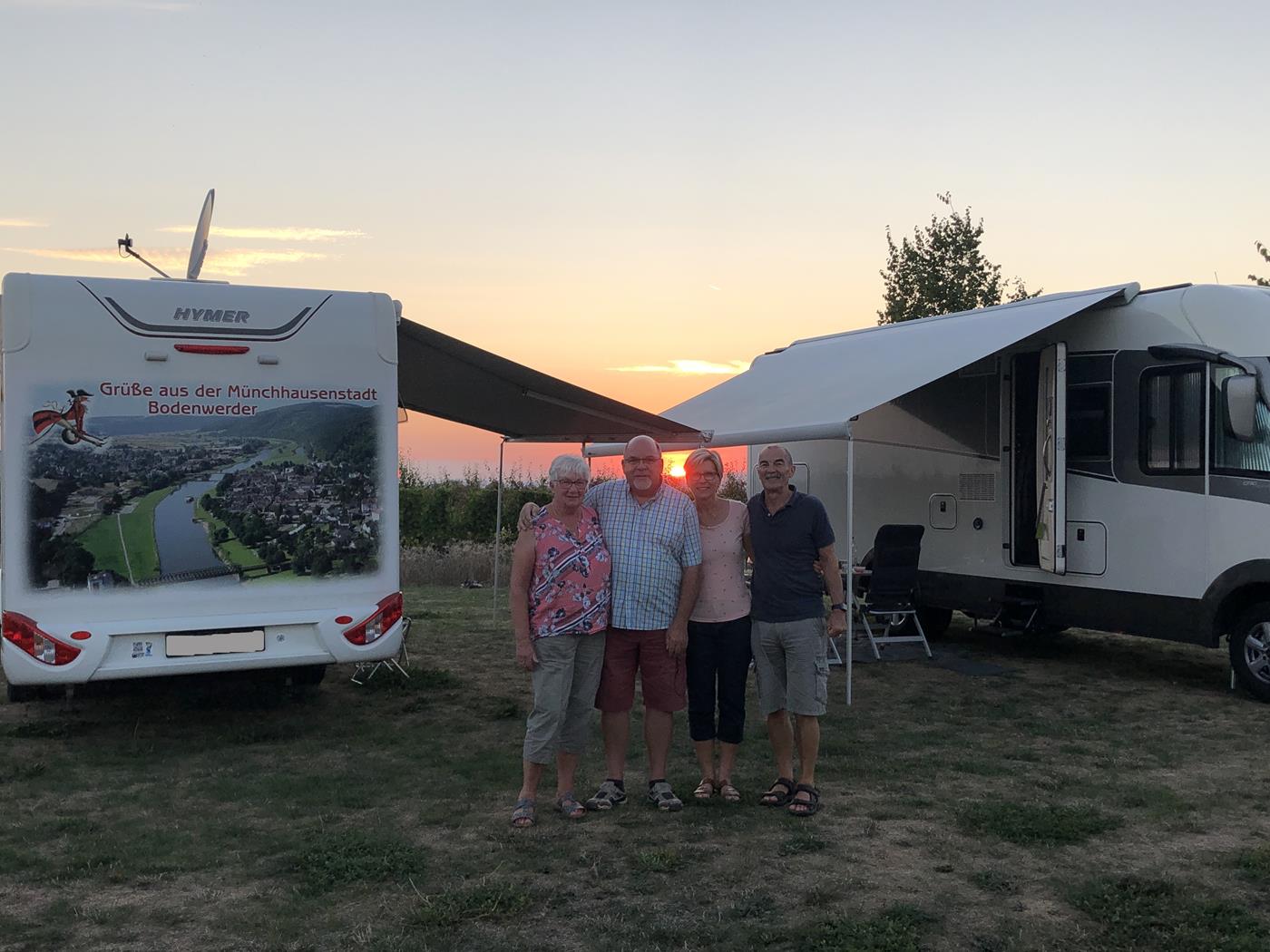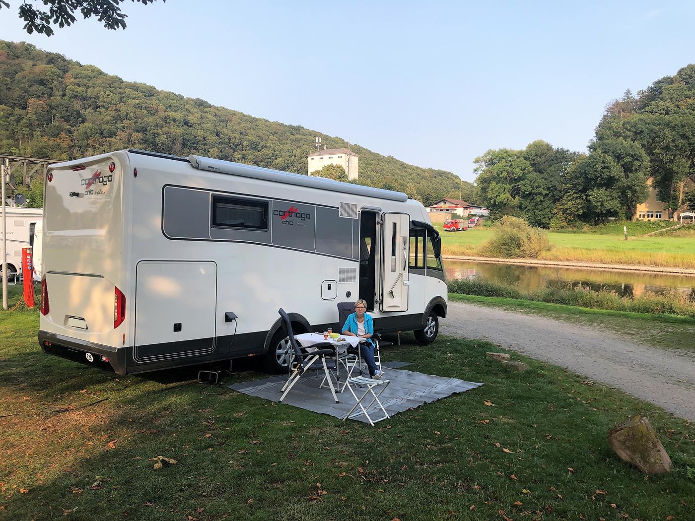Dieter nimmt uns beim Penny-Parkplatz in Empfang und lotst uns zum Wohnmobilstellplatz Bodenwerder, wo wir den letzten Platz am Wasser erhalten. Später kommt Dieter mit Brunhild auf den Stellplatz. Die Überraschung ist gelungen, Brunhild freut sich riesig und wir freuen uns, morgen an der Geburtstagsfeier dabei sein zu dürfen.