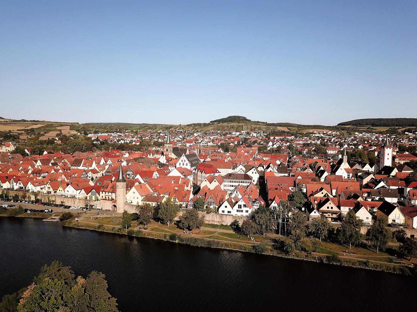 Nachdem wir uns eingerichtet haben spazieren wir dem Main entlang und sammeln Baumnüsse und Kastanien. Bevor wir in das Städtchen gehen, lasse ich noch die Drohne steigen, um ein paar Aufnahmen zu machen. Nach dem Stadtbummel nehmen wir das Abendessen im Städtchen ein, es gibt geschmorte Ochsenbäckchen.