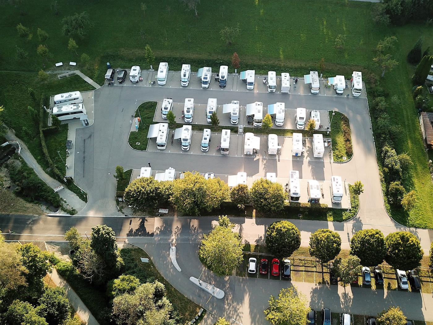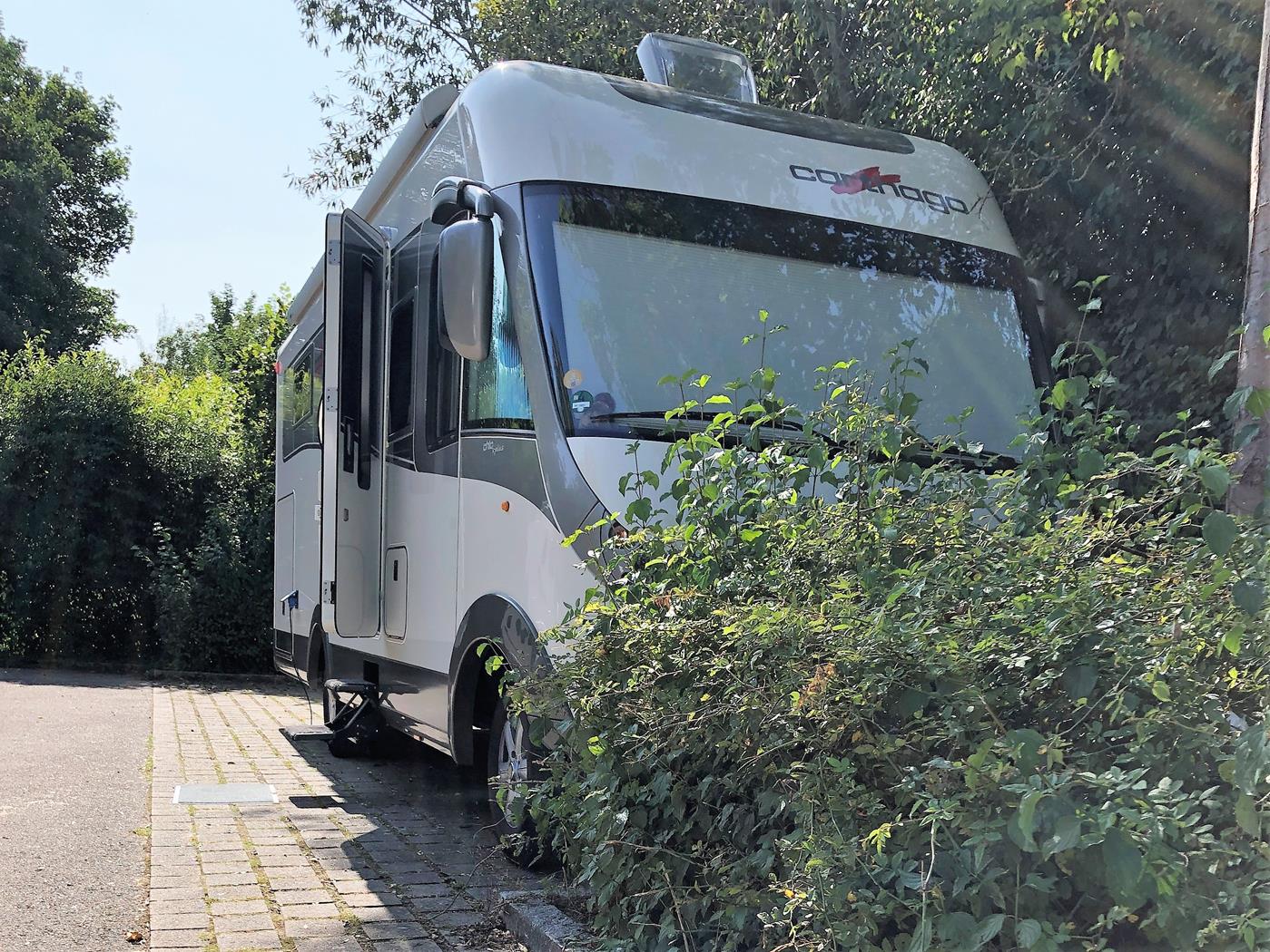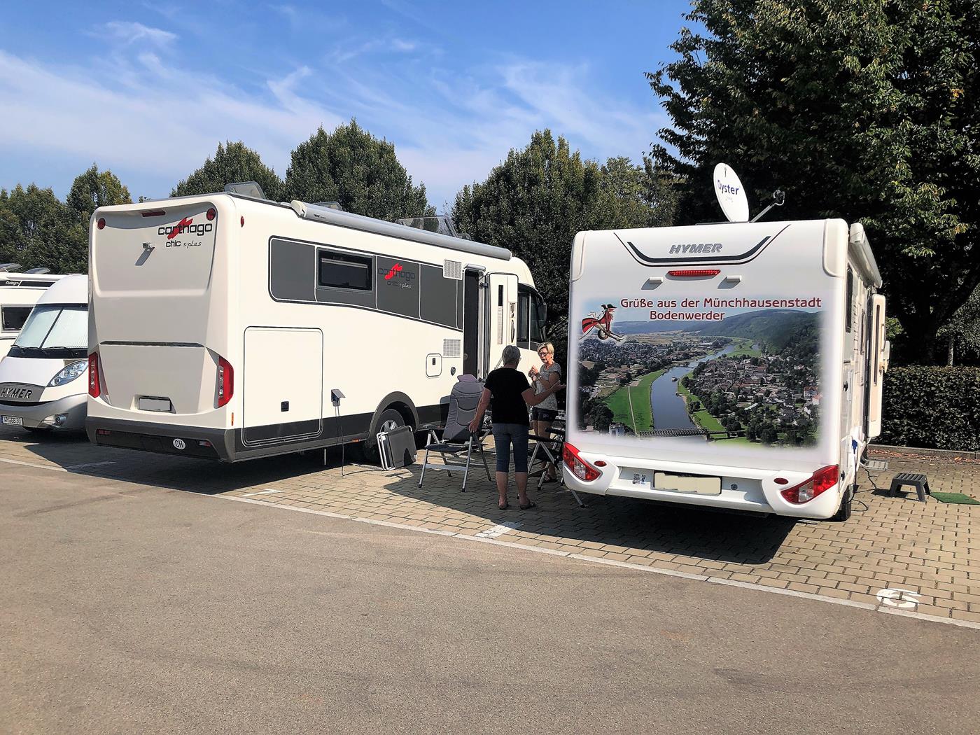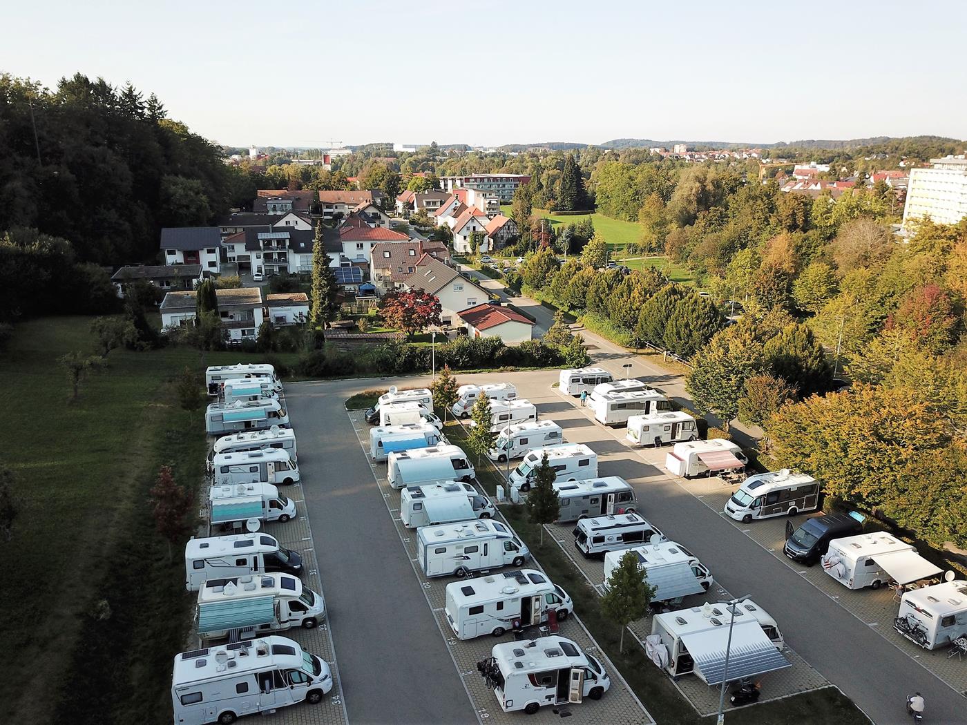Auch auf dem Stellplatz in Bad Waldsee finden wir zwei Plätze nebeneinander und unser Wohnmobil passt gerade so auf die Parzelle.