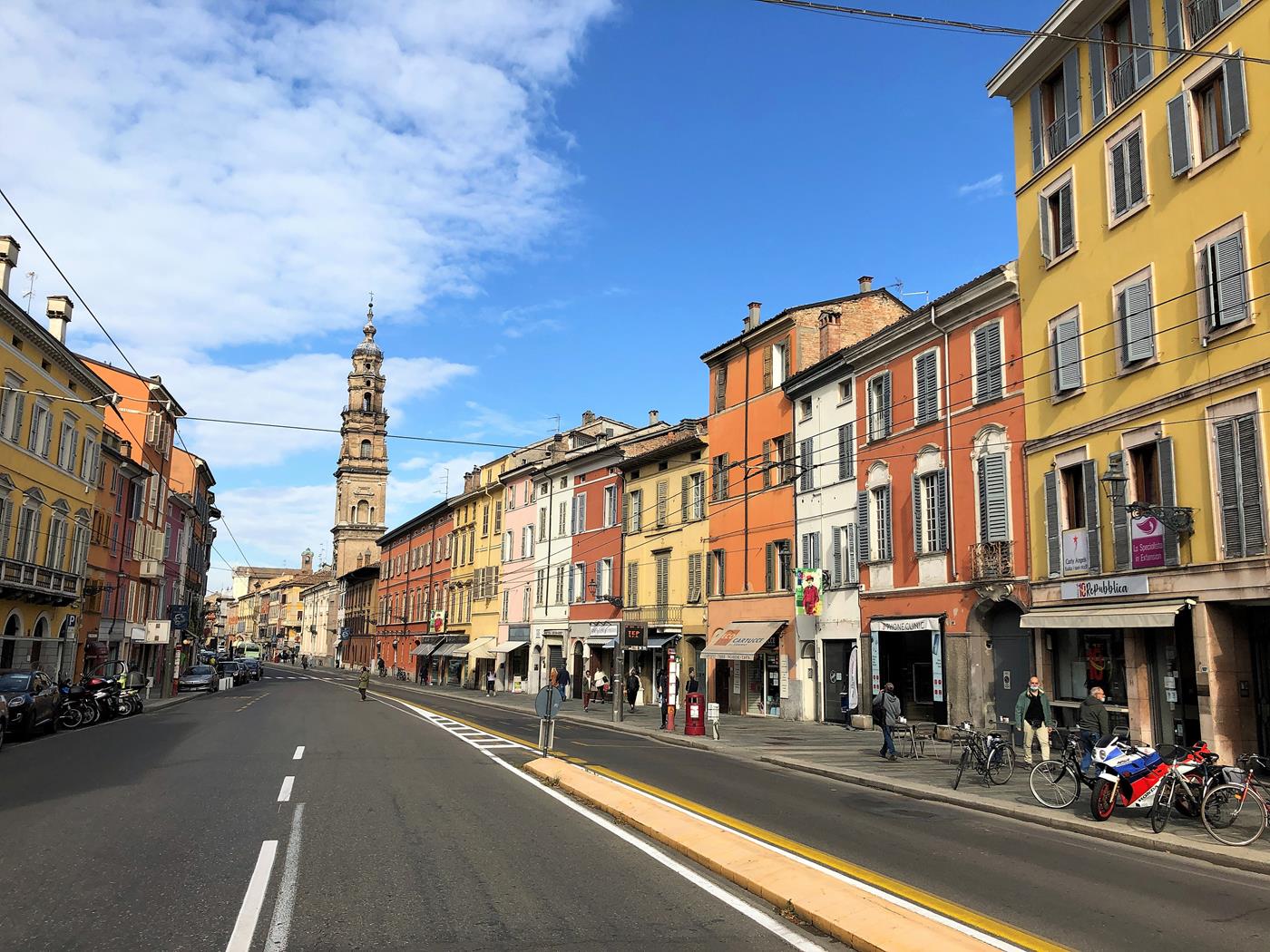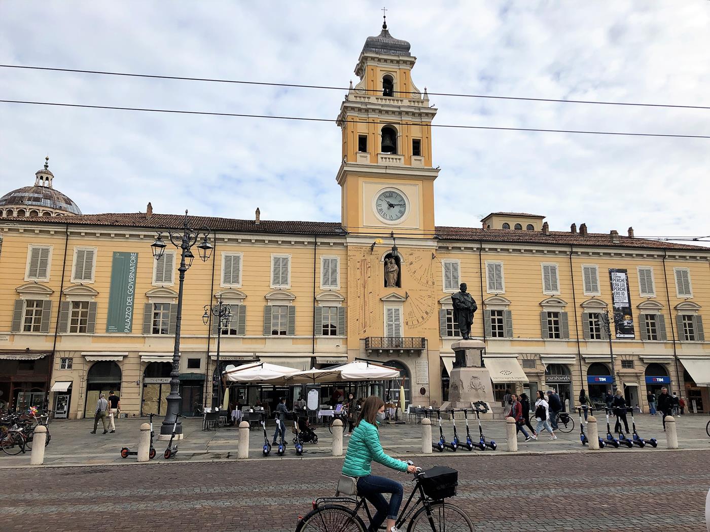 Um eine Stadtbesichtigung zu machen fahren wir mit dem Bus Nr. 23 in das Stadtzentrum was etwa 15Minuten dauert. Die Universitätsstadt Parma ist mit ihren romanischen Gebäuden eine Besichtigung wert. Wegen der Corona-Pandemie fehlt jetzt aber das südländische Lebensgefühl. Nach unserer Besichtigung setzen uns noch in ein Strassenkaffee, um ein Cappuccino und Cornetto vuoto zu geniessen.