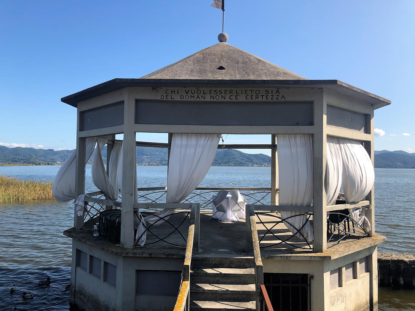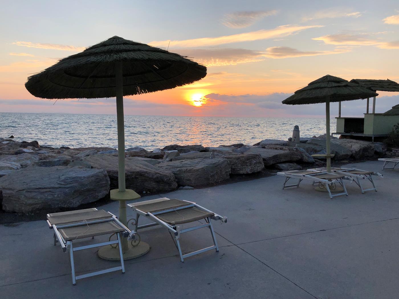 Wir treffen uns mit unseren Freunden Eva, Melanie und Peter zu einem Apéro auf der Pontile Bellavista Vittoria in Lido di Camaiore. Vor dem Abendessen können wir einmal mehr einen wundervollen Sonnenuntergang geniessen.