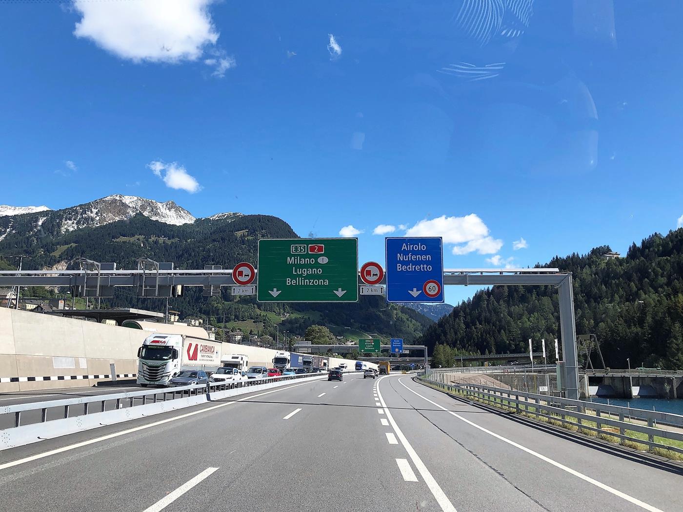 Wir fahren erst am Montag los, in der Annahme eine staufreie Reise vor uns zu haben. Das war falsch gedacht, denn schon bei der Abzweigung Richtung Luzern-Gotthard sehen wir die Staumeldung: "A2 Gotthard-Tunnel 7km".