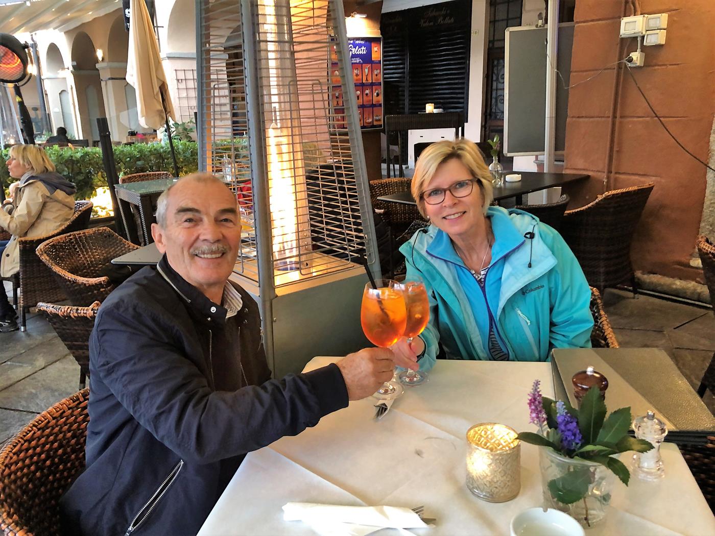 Wir richten uns schnell auf unserem Platz ein und spazieren dann ohne Regenschirm und trockenen Fusses durch das Städtchen zu unserem Lieblingsrestaurant Caffé Verbano.