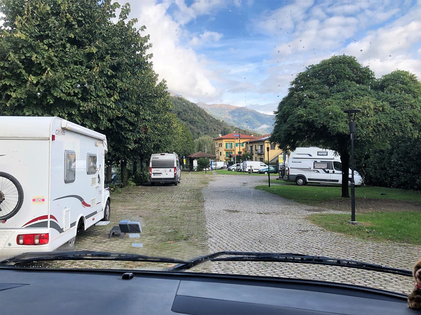 Kurz vor Brissago kommen wir noch in ein heftiges Gewitter, aber bis zum Stellplatz in Cannobio bessert sich das Wetter wieder und da der Markt vorbei ist, hat es auch viele freie Plätze auf dem Stellplatz.