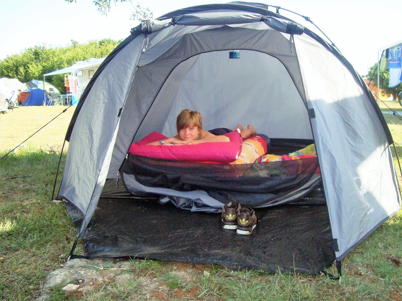 An der Rezeption bin ich erstaunt, eine Plakette mit der Nummer 59 zu erhalten, statt der reservierten 538. Ich mache die Empfangsdame darauf aufmerksam, dass ich Platz Nr. 538 reserviert habe und für diesen auch eine Bestätigung erhalten habe. Wir fahren zum angewiesenen Platz und mein Verdacht bestätigt sich – dieser Platz ist überhaupt nichts für uns. Er befindet sich ganz am Rand des Campingplatzes unter Bäumen neben dem Tennisplatz. Wir radeln zurück zur Rezeption, verlangen die Liste mit den freien Plätzen und machen uns auf die Suche nach einem für uns geeigneten Platz.