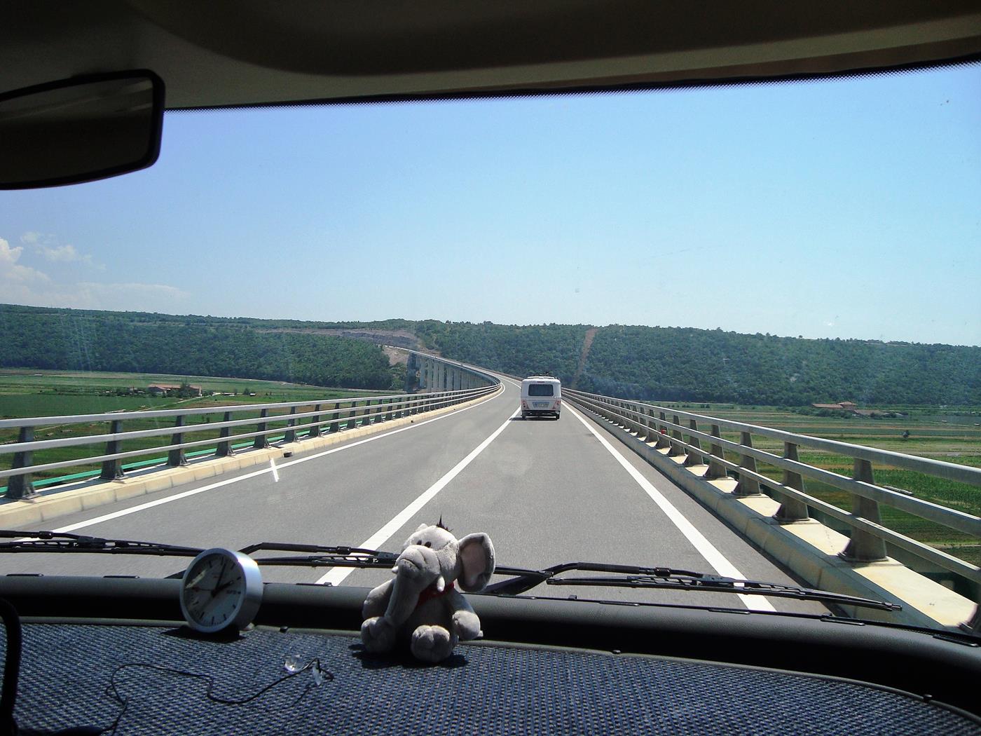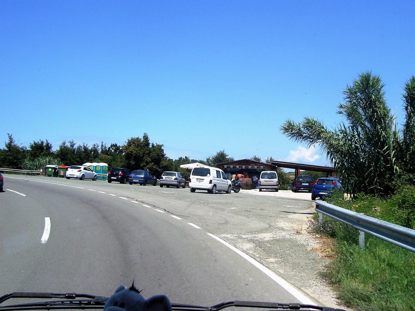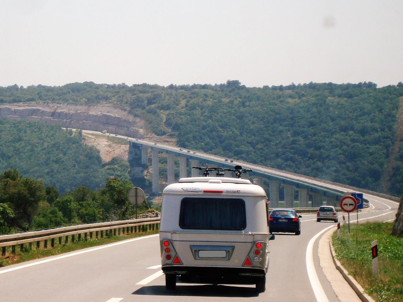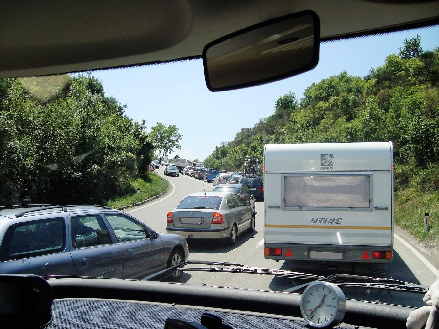 Nach dem Einkaufen in Triest fahren wir der Küste entlang bis nach Koper (Slowenien) und dann via Isola – Portoroz zur kroatischen Grenze. Die Route dem Meer entlang ist sehr malerisch und wir freuen uns auf die Badeferien.Sehr bald erreichen wir den slowenischen Grenzposten – es sollte dann nur noch eine ganz kurze Strecke bis zur kroatischen Grenze sein. Nach dieser Kurve ist fertig lustig und wir stecken im Stau. Ein Unfall verschärft die auf dieser Strecke bekannte Staugefahr noch und so geht es für die nächsten Kilometer nur noch schrittweise voran!